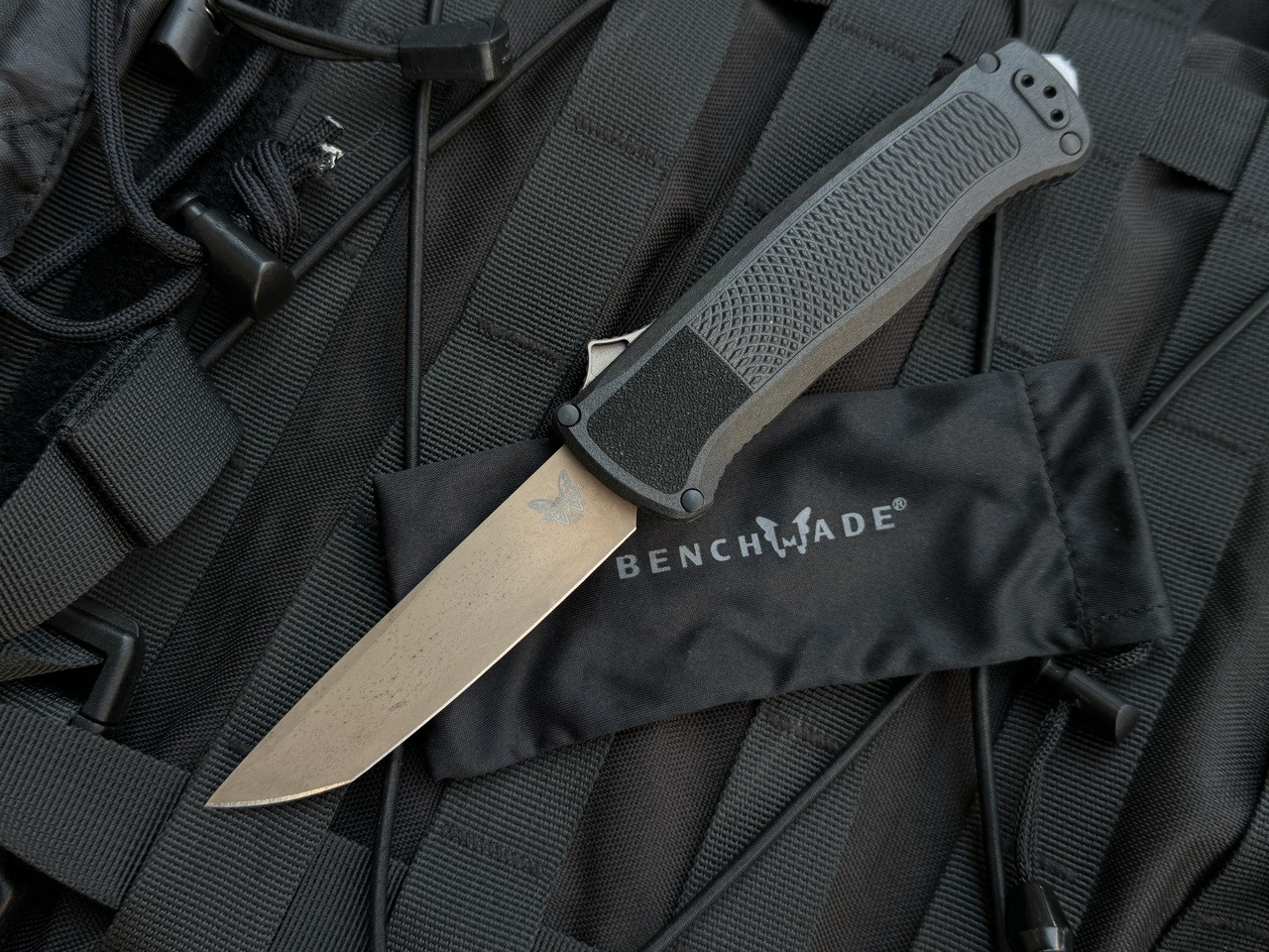This is a Benchmade Shootout OTF in black with a CF Elite lightweight body. The blade and hardware and bronzed and the blade is a tanto edge. This was brought on consignment from a local client. The body does not appear to have any wear or tear on it. The blade does have surface rust on it, though no other apparent wear.