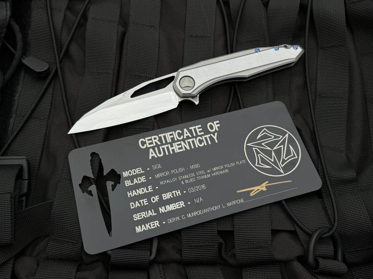 This Marfione Sigil is a beautiful piece on consignment with us for a long time client of ours. This piece has a royalloy stainless steel body, blue titanium hardware, and a perfectly mirrored blade. The coolest part of this knife is the polished pivot plate, to blend in with the sterile look. The knife is in excellent overall condition, with the only wear being some very slight snail trails/scratches on the body and one on the pocket clip