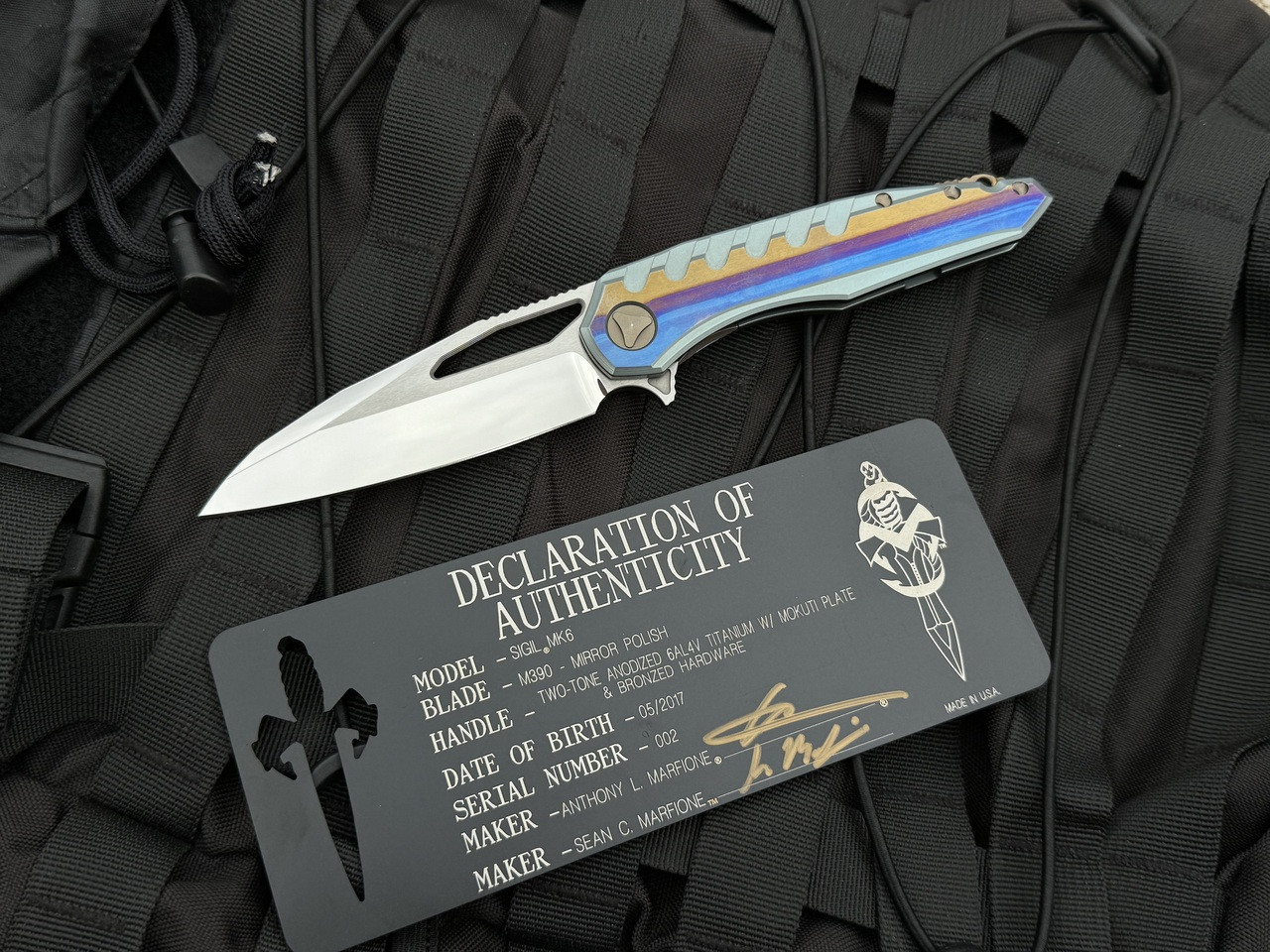 This is a Marfione Custom MK6 Sigil on consignment with us for a long time client. This piece is in overall good to great condition with some visible scratches and snail trails on the anodization of the body and pocket clip. The blade is in excellent condition, with minimal marks/spots found on the polish.