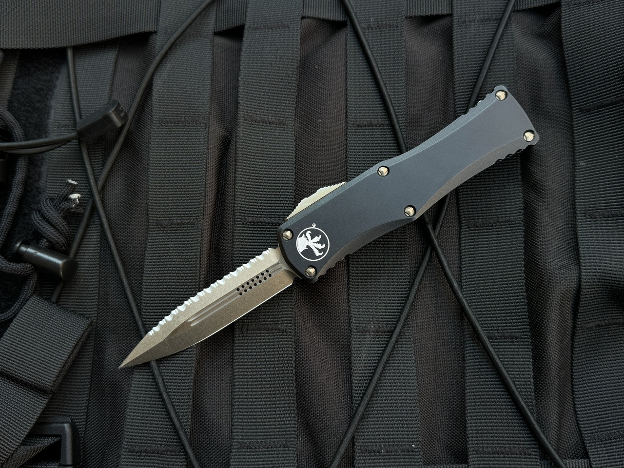 This is a Microtech Knives Hera D/E in black with bronzed hardware and a matching bronzed full serrated blade. This was brought into us from a local client for consignment. This knife is overall in great condition with only some minor snail trails on the body, mostly appearing on the lasered logo. The clip, however, is stretched and no longer contacts the body of the knife, thus providing no retention to the pocket of the user. This can be remedied by Microtech. The blade exhibits minor wear, with a minor roll of the tip of the blade. None of the bronzing is worn off and the edge is still good. The action of the knife is unaffected.
