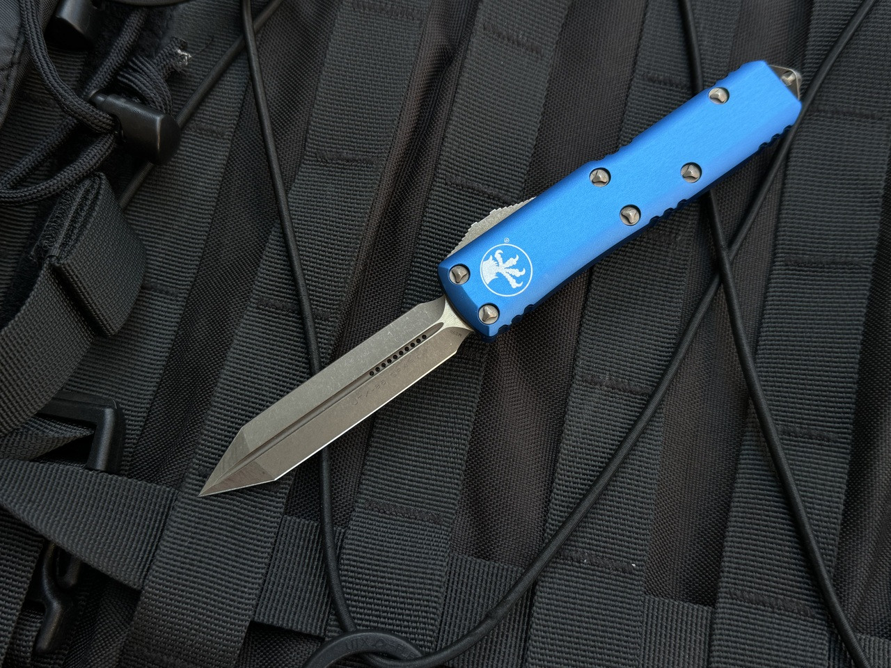 This is a Microtech Knives UTX-85 spartan in blue with bronzed apocalyptic hardware. The body of this knife exhibits usual signs of wear, namely snail trails on the body, though no large scratches or gashes. The pocket clip shows similar wear, snail trails throughout. The action is unaffected and the blade shows some signs of wear, namely towards the tip. The knife is alone, with no box nor pamphlet.