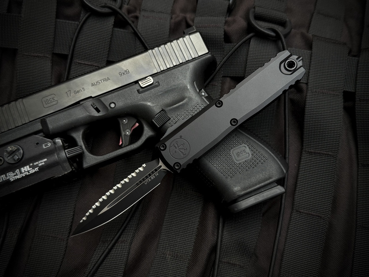 FACTORY BLEM Microtech UTX-85 Gen IV Tactical Black Aluminum Body w/ M390MK Tactical Black Full Serrated Blade (3.1") 12324-3T