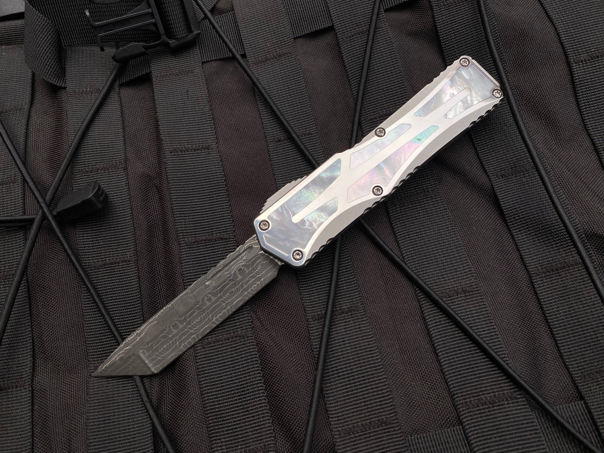 Heretic Knives Custom Colossus Hand Rubbed Stainless Steel Mother of Pearl Inlaid Body w/ Vegas Forge Damascus Tanto Edge Blade (3.5")