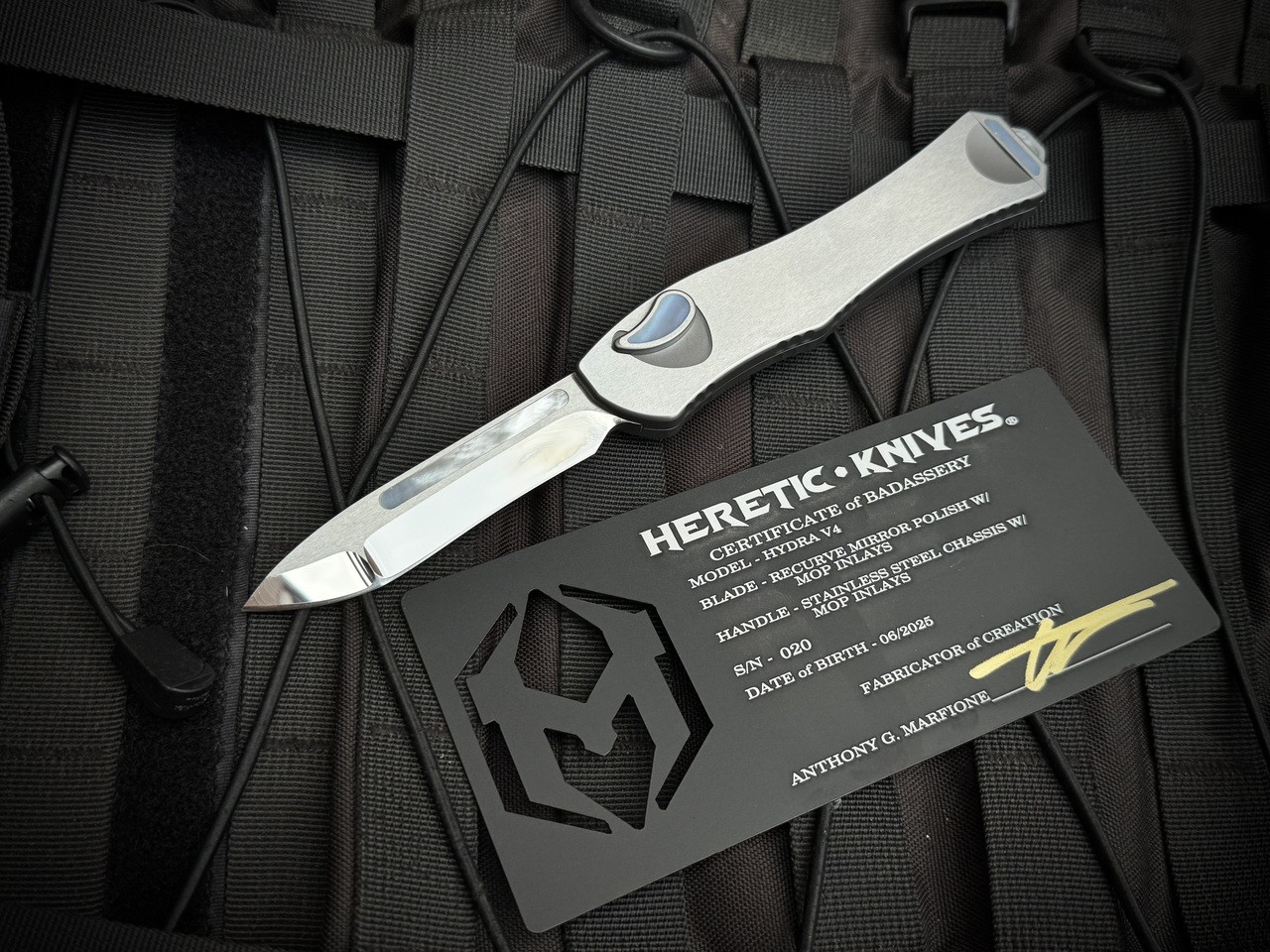 Heretic Knives Custom Hydra V4 Recurve Stainless Steel Body and MOP Inlays w/ MOP Inlaid High Polished Blade