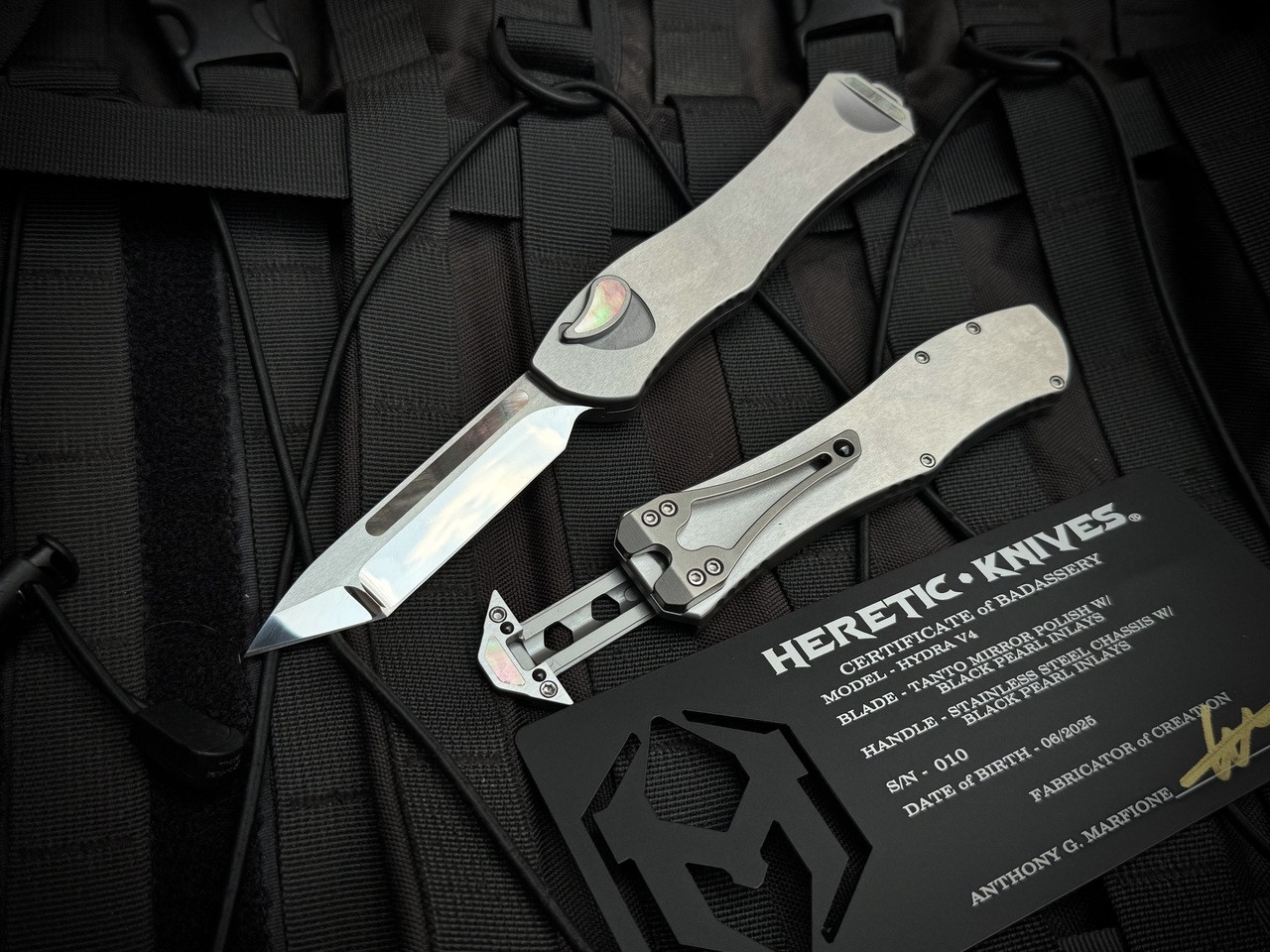 Heretic Knives Custom Hydra V4 T/E Stainless Steel Body and Black Pearl Inlays w/ Black Pearl Inlaid High Polished Blade