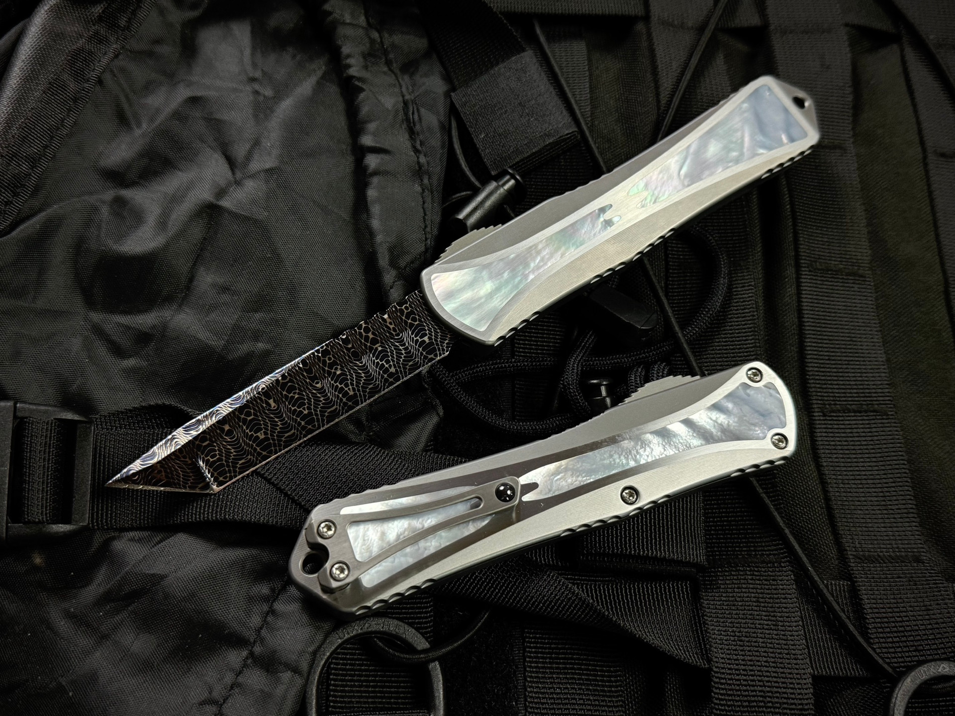 Heretic Knives Custom Manticore X T/E Stainless Steel Mother of Pearl Inlaid Body w/ Blue Damascus Plain Edge Blade (3.7")