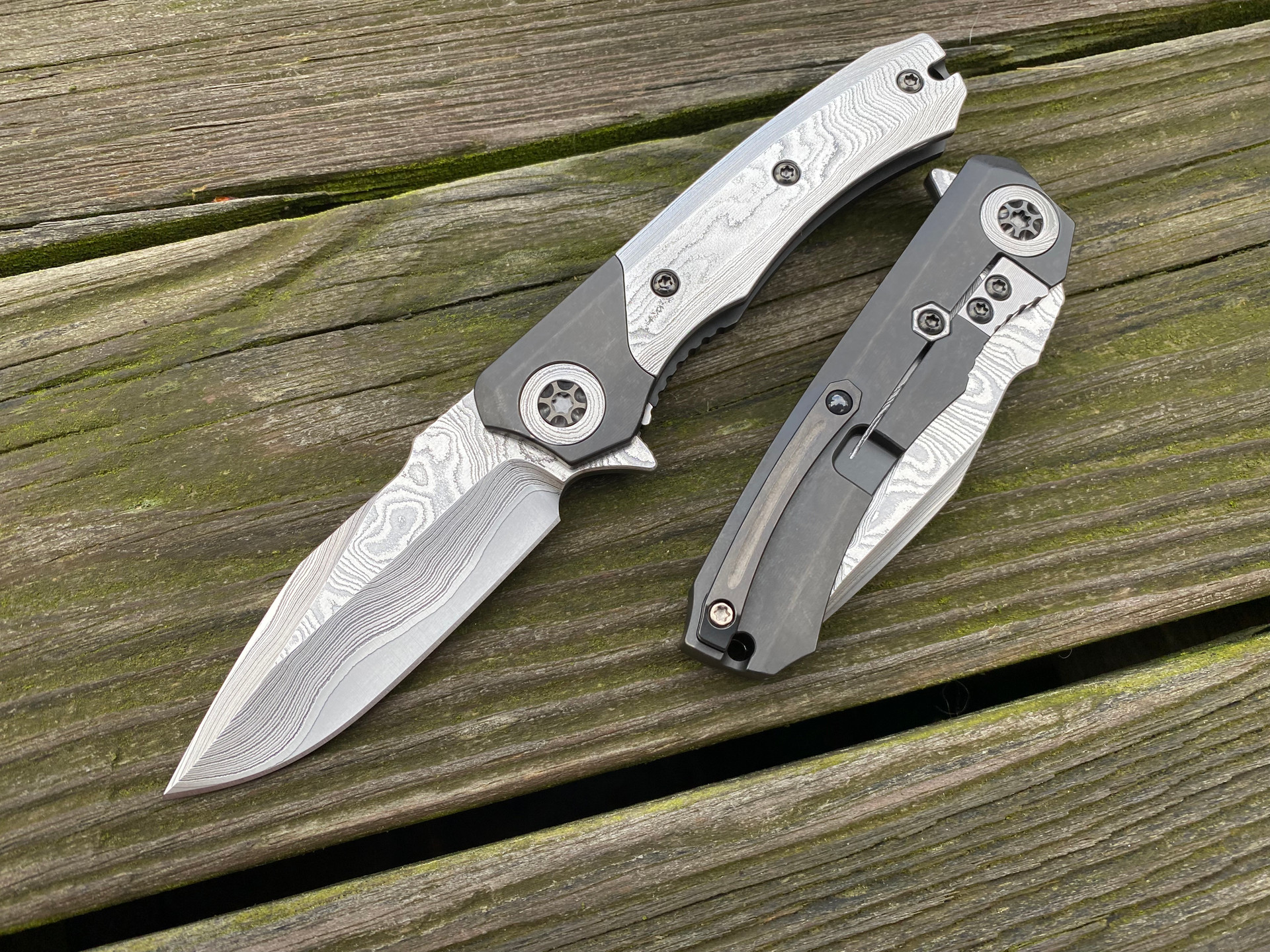 Heretic Knives Custom Wraith Flipper S/E VF Wood Grain Damascus and DLC Titanium Body w/ VF Wood Grain San Mai Damascus Blade (3.6")