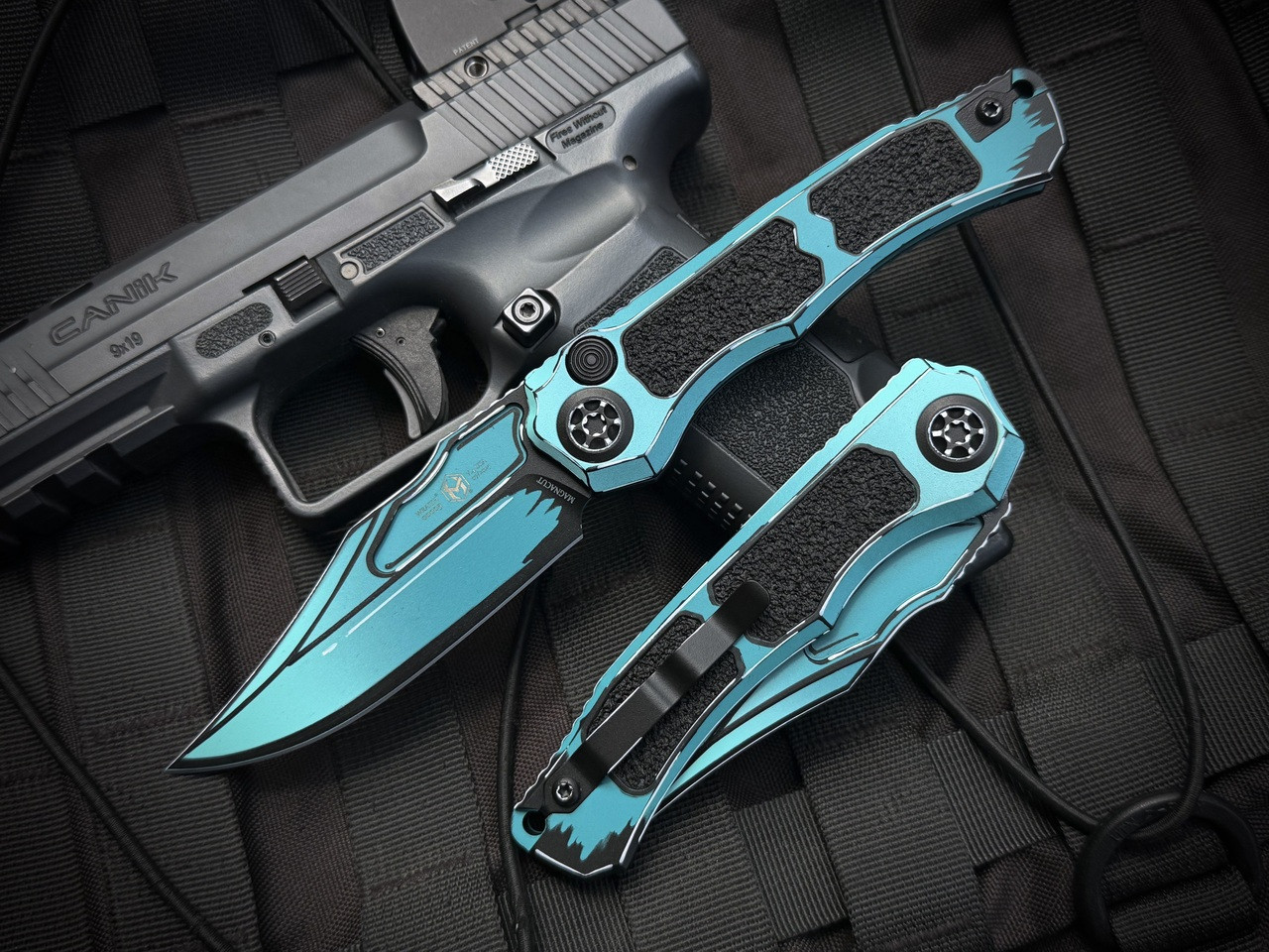 Heretic Knives Wraith Bowie Auto Folder Cel Shade Turquoise Body w/ Magnacut Cel Shade Plain Edge Blade (3.625") H002-CS-TQ