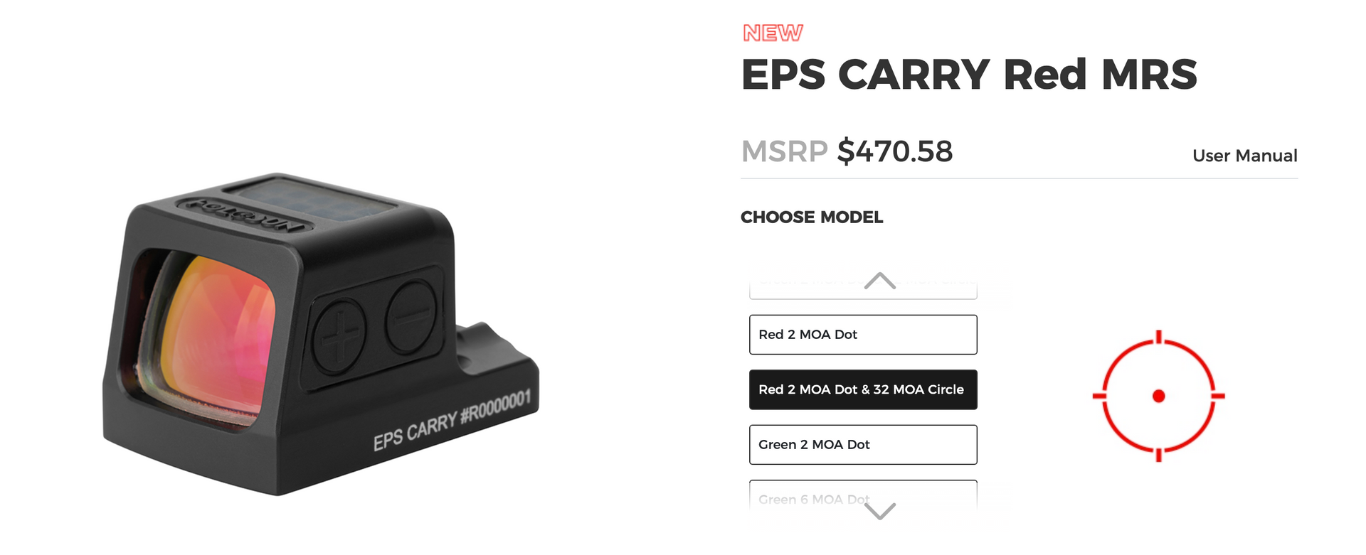 EPS Carry–RD-MRS has Holosun’s 650nm Red Super LED with Holosun’s MRS (Multi-Reticle System) and uses a 1620 battery which provides up to 50k hour battery life, Solar Failsafe, and Shake Awake technology. EPS Carry-RD-MRS is compatible with popular subcompact pistols including G43 MOS, G48 MOS, Hellcat, P365 X/XL, and more.