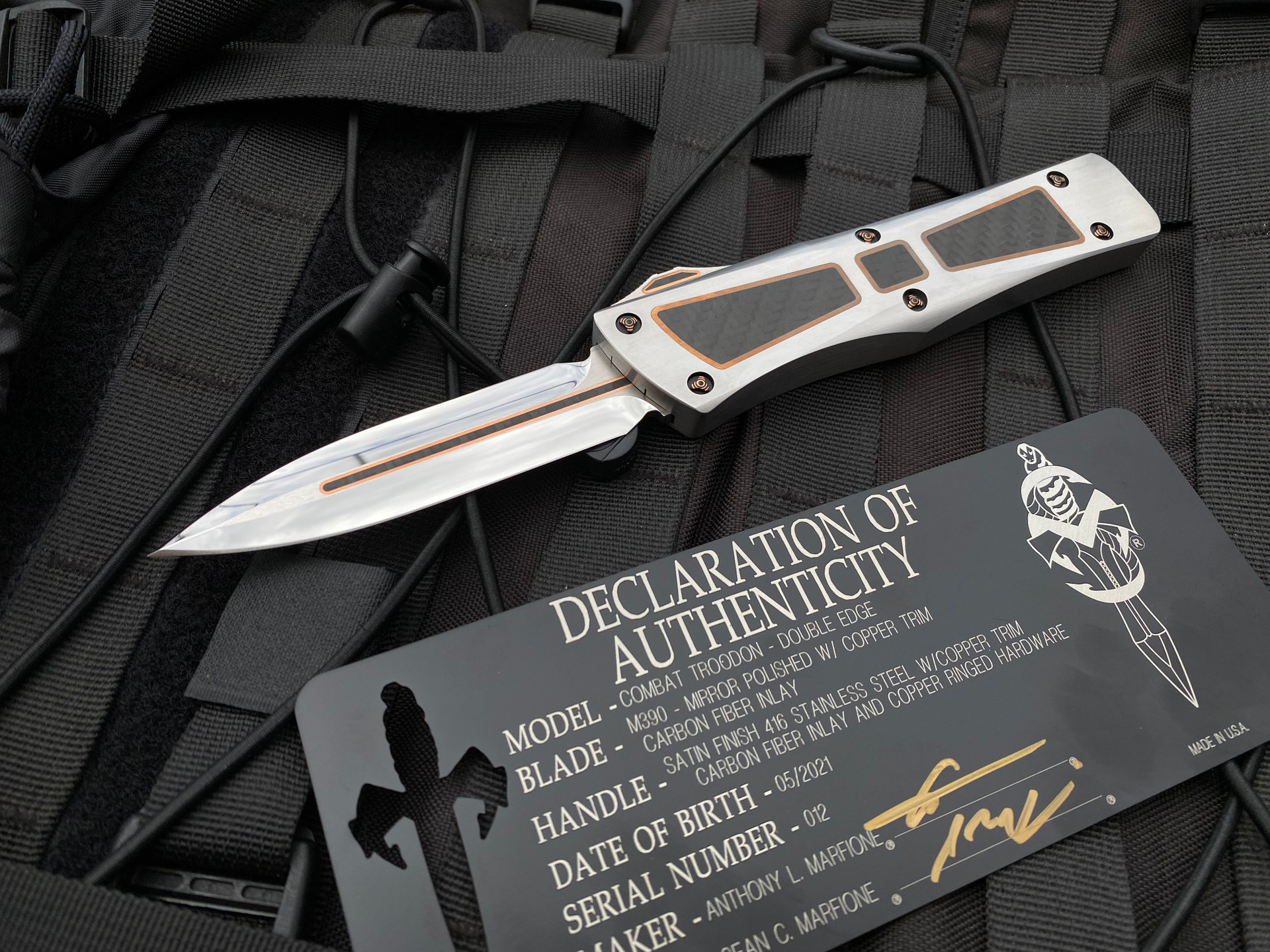 Marfione Custom Combat Troodon D/E 416 Stainless Steel Body w/ Copper Trimmed Carbon Fiber Inlays and M390 Mirror Polished Blade (3.8")