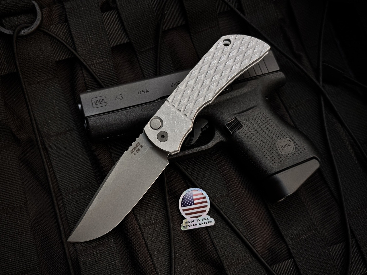 We added our bent Titanium clip to the aluminum handles and very strong spring for smooth, super snappy deployment.