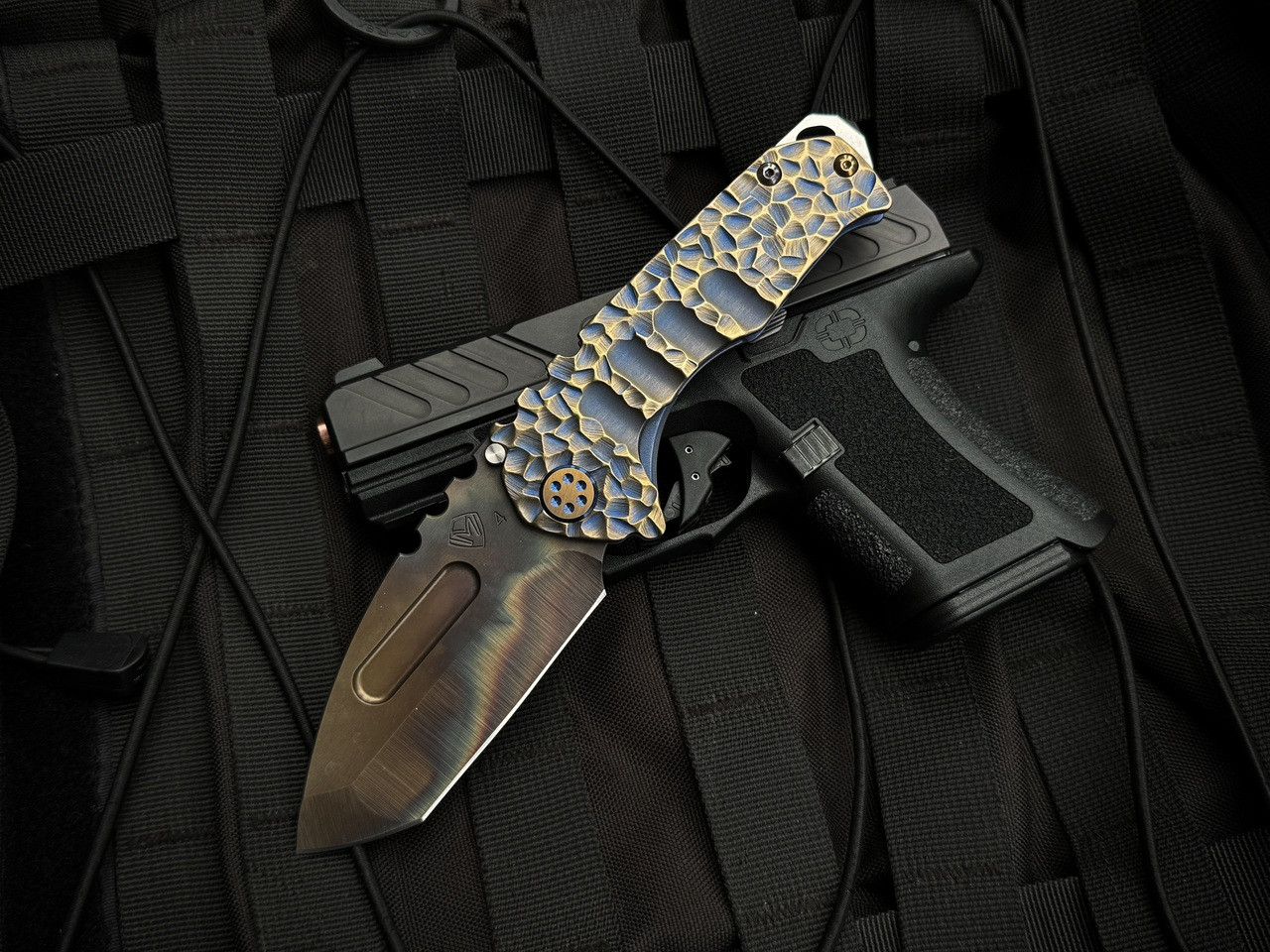 Medford Genesis T Folder Sculpted Black/Bronze-Blue "Peaks and Valleys" Titanium Body w/ S45VN Vulcan Tanto Plain Edge Blade (3.3")