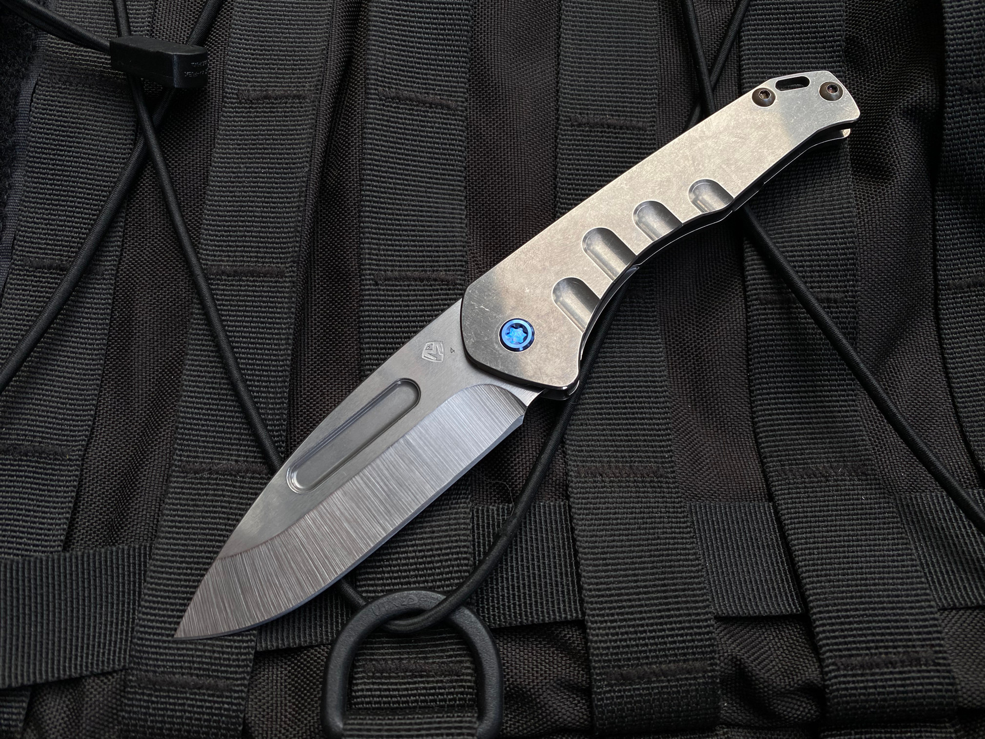 Medford Prae Slim Folder Tumbled Titanium Body and Blue Hardware/Clip w/ S45VN Drop Point Tumbled Plain Edge Blade (3.25")
