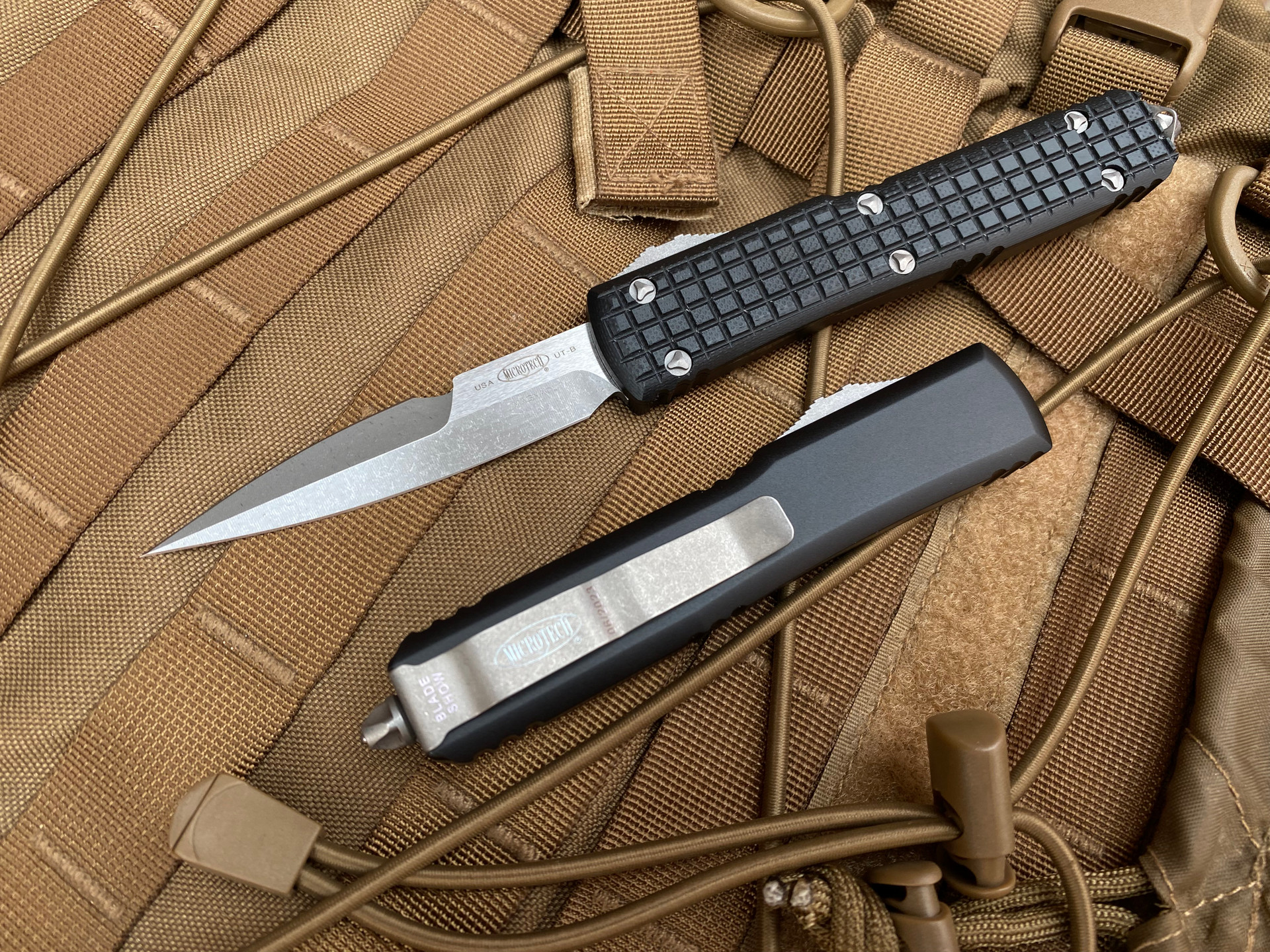 Microtech 2023 Bladeshow Special Ultratech Bayonet Black Frag Pattern G10 Topped Body w/ CPM Magnacut Apocalyptic Plain Edge Bl