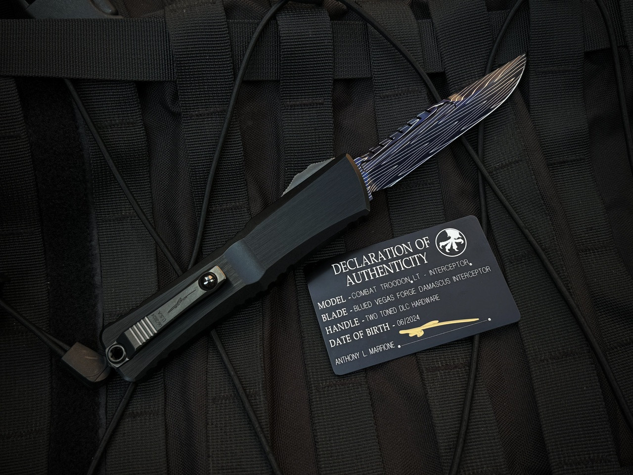 The Microtech Combat Troodon Interceptor Signature Series 1217-16MS3 is a premium knife designed for enthusiasts and professionals seeking exceptional performance and aesthetics. Its Interceptor blade with a Blued Vegas Forge Damascus finish and plain edge delivers outstanding cutting capabilities and visual appeal. The black hefted alloy handle enhances durability and grip, making it a reliable tool for various applications.