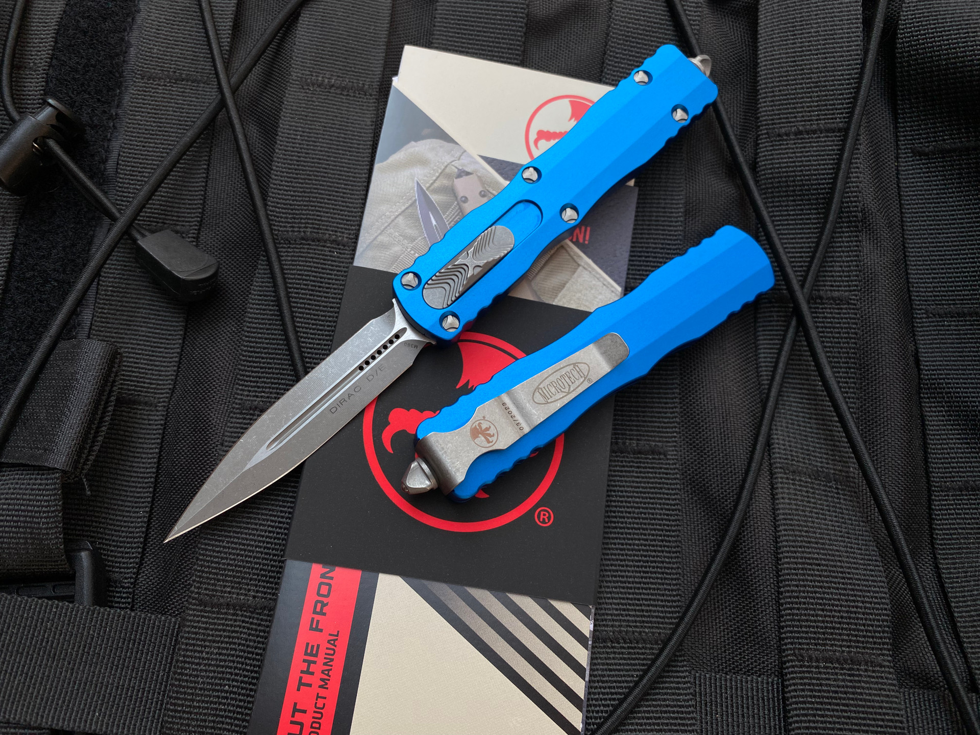 Description: Marrying aesthetics with impeccable performance, the Microtech Dirac in Apocalyptic Blue showcases a battle-worn blade coupled with a striking blue handle. The top-mounted switch ensures effortless deployment, making it a must-have for both new and experienced knife enthusiasts.