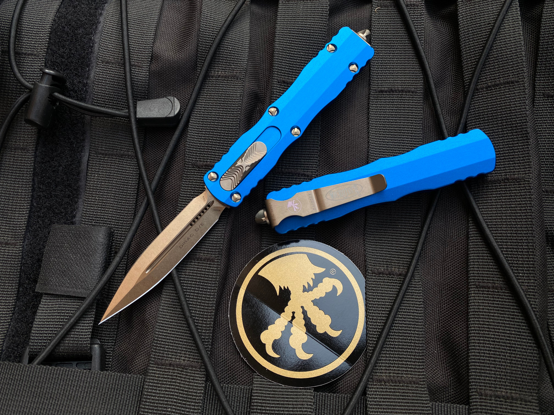 The Microtech Dirac stands out with its top-mounted switch, ensuring ease of use and swift deployment. The combination of a double-edged blade and a captivating bronzed finish exudes character and durability. The vibrant blue handle not only heightens its aesthetic appeal but ensures ergonomic handling. Whether you're engaging in daily chores or complex operations, the Dirac, renowned for its lighter action, won't disappoint.