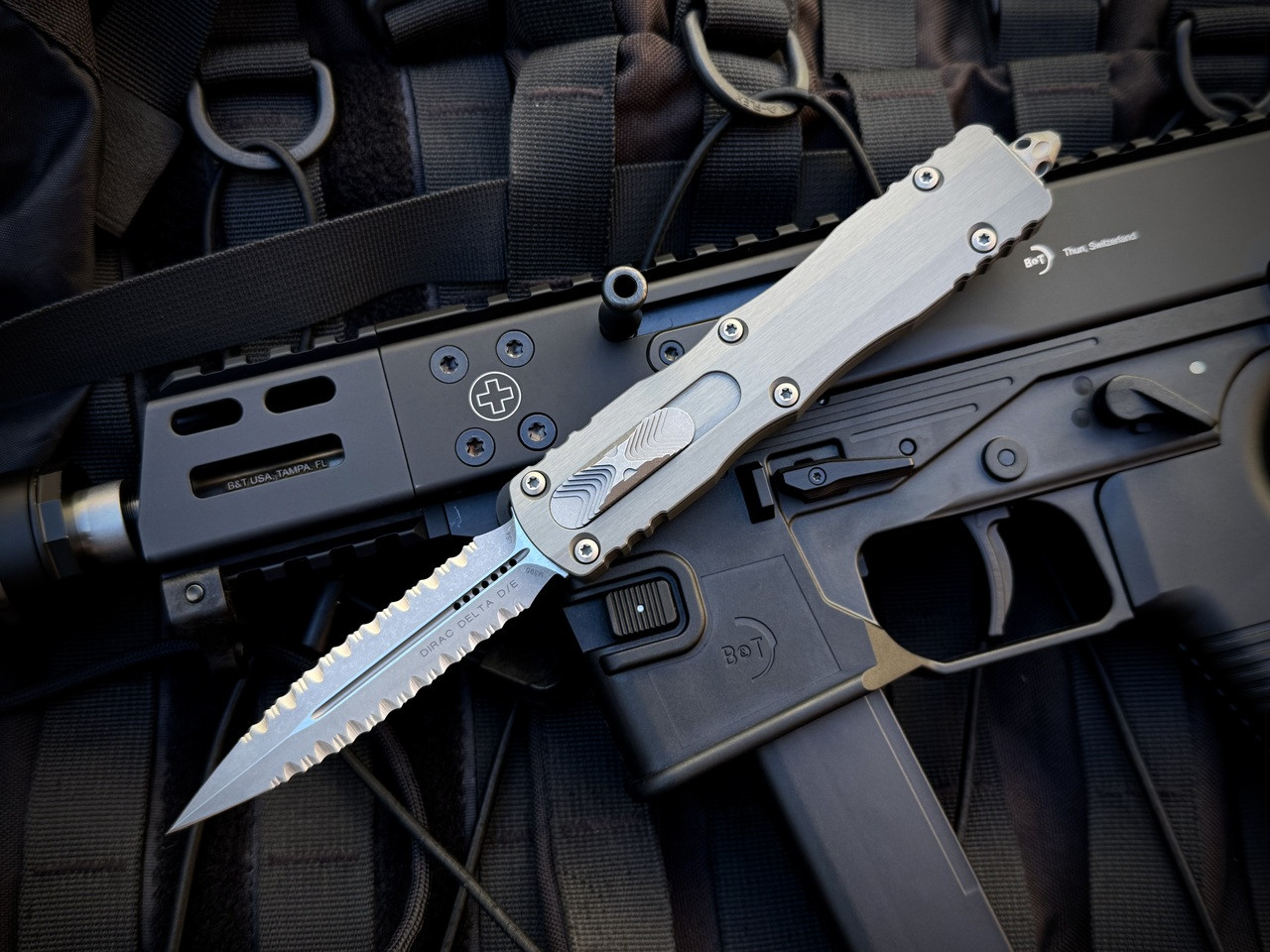 Microtech Dirac Delta D/E Natural Clear Aluminum Body w/Apocalyptic Double Full Serrated Blade (3.8") 227-D12APNC