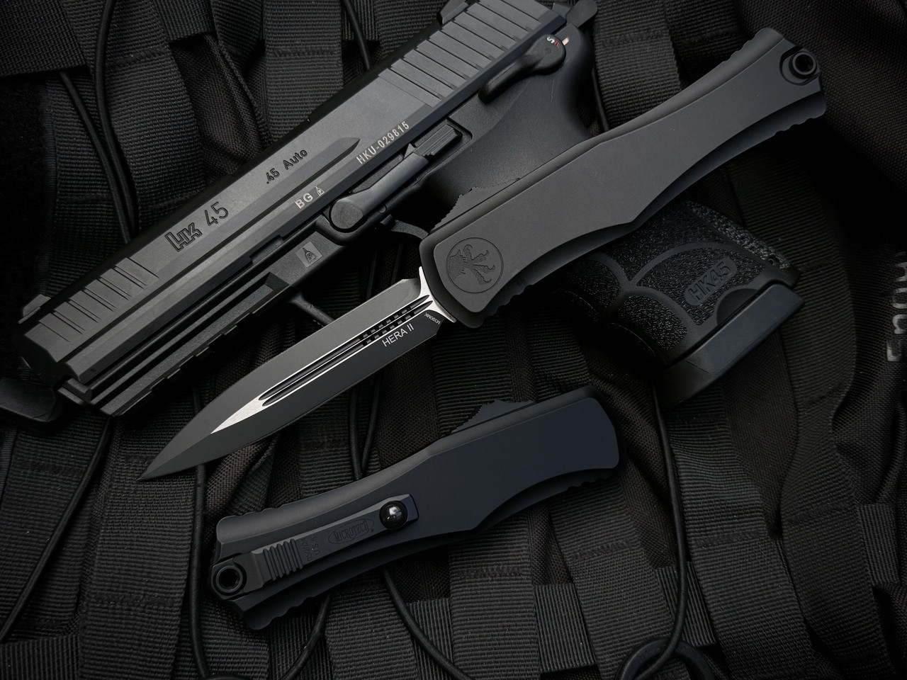 Microtech Hera II Tactical Black Aluminum Body w/ M390MK Black Plain Edge Blade (4") 1702-1T