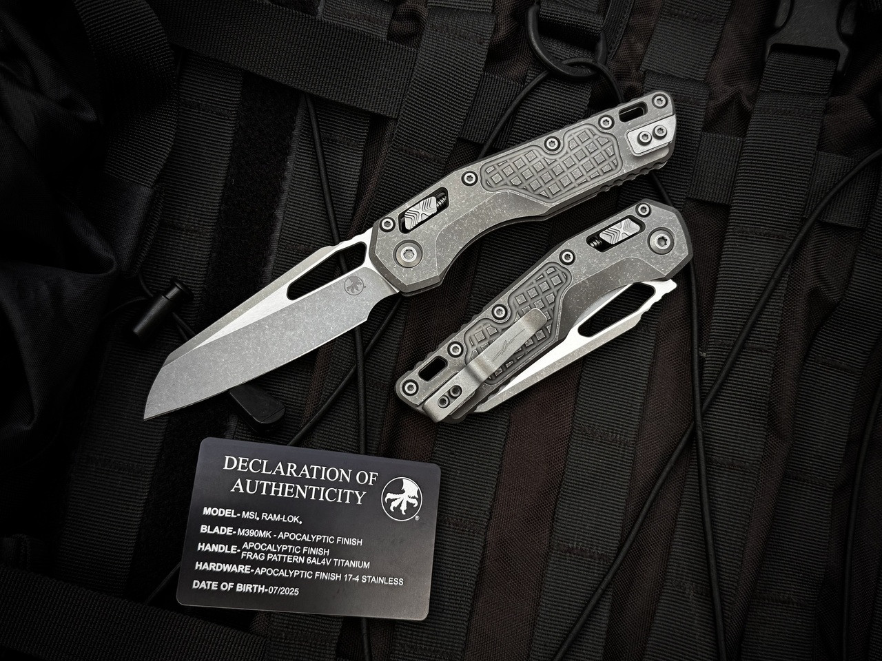 Microtech MSI RAM-LOK Folder Marfione Select Apocalyptic Titanium Frag Pattern Body w/ M390MK Apocalyptic Plain Edge Blade (3.75") 210-10APFRMS1