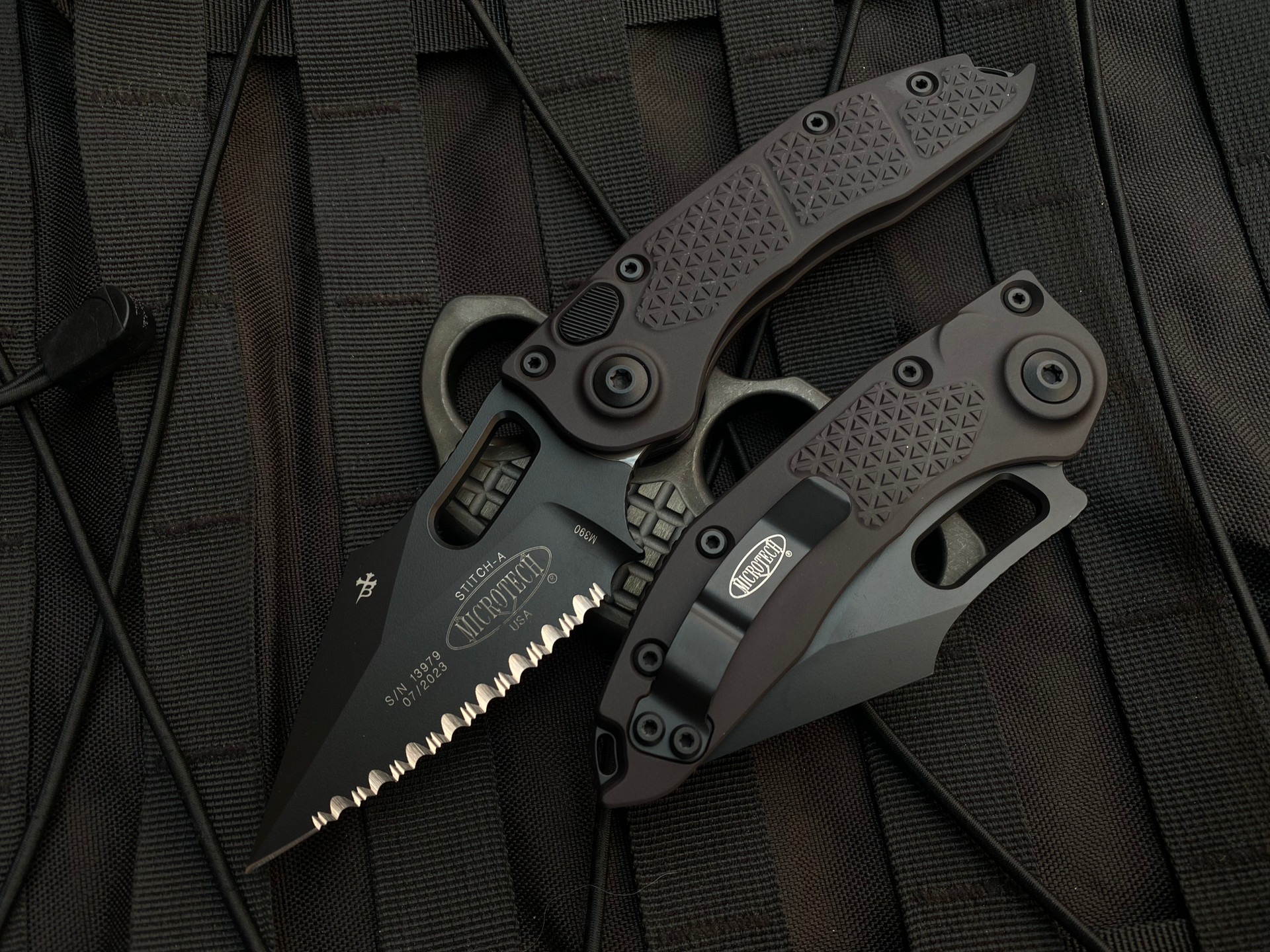 Microtech Stitch S/E Auto Folder Tactical Black Aluminum Body w/ Tactical Black Full Serrated Blade (3.75") 169-3T