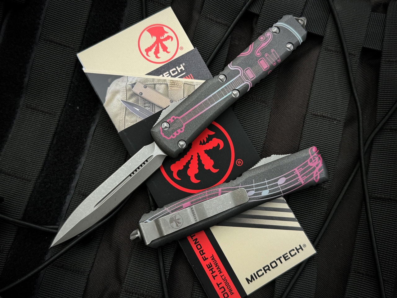 Microtech Ultratech D/E NCKS 2023 Signature Series Pink/Light Blue Guitar Motif Body w/ Apocalyptic Plain Edge Blade (3.4") 122