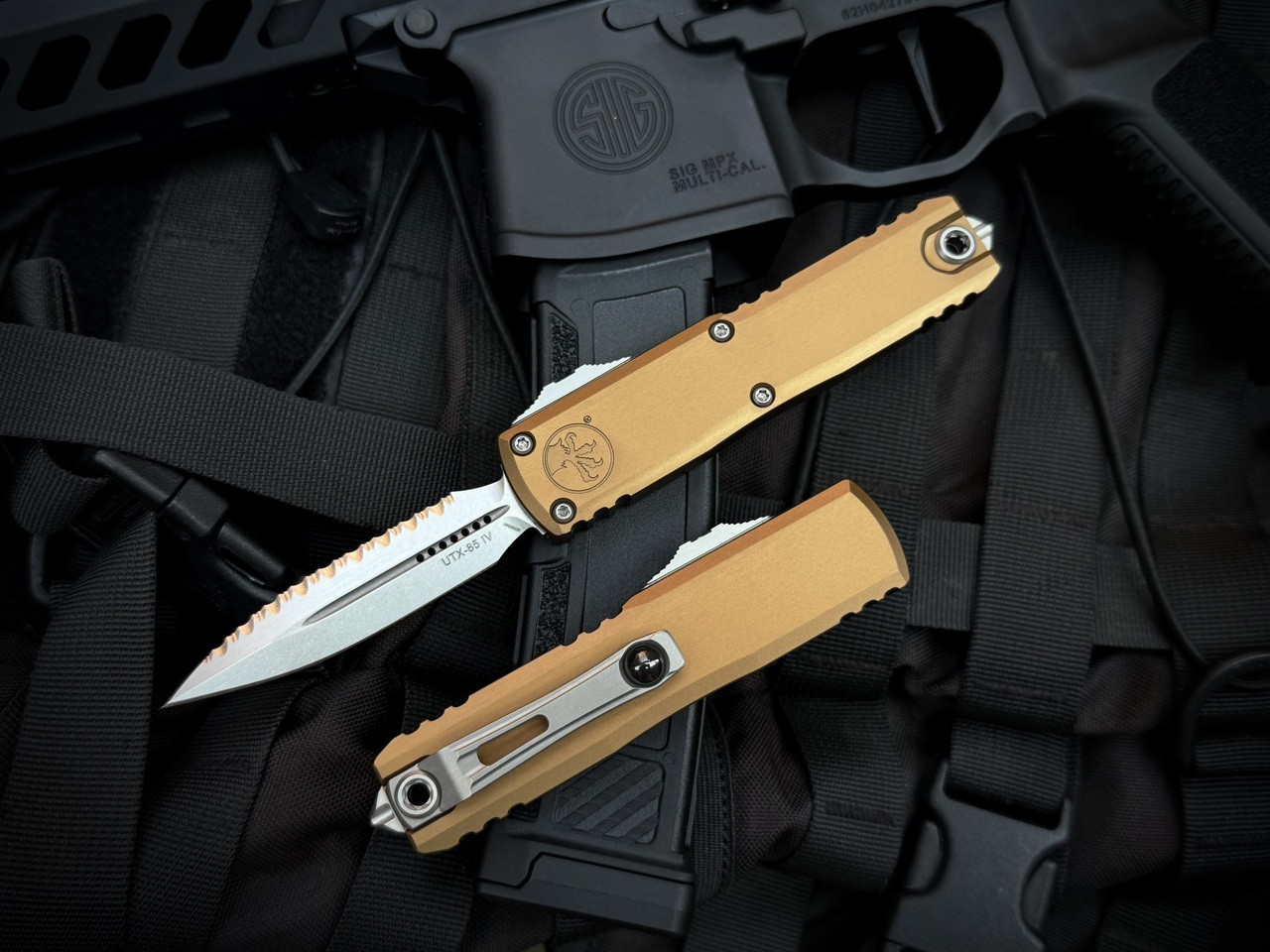 Microtech UTX-85 D/E Gen IV Tan Aluminum Body w/ M390MK Stonewashed Full Serrated Blade (3.1") 12324-12TA