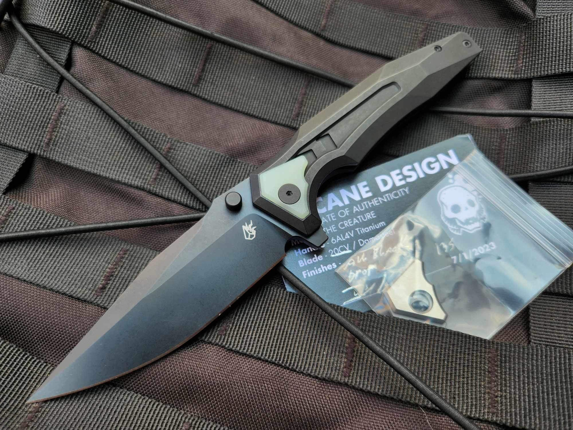 This is a pre owned Creature from Arcane Design. All blacked out configuration with Jade G10 pivot collars and a drop point blade with minimal wear overall. In excellent used pre owned condition. Please see above photos for condition. If you need more photos or need more information, please contact us directly.