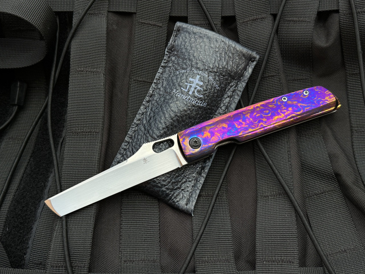 PRE-OWNED Jason Clark Custom Folder Blasted Ti and Timascus Body and Timascus Pocket Clip w/ XHP Rubbed Satin Blade (3.8")