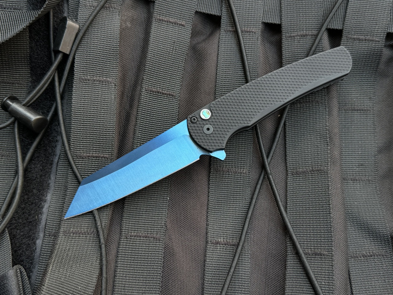PRE-OWNED Pro-Tech Malibu 2021 NYCKS Edition Textured Black Aluminum Body and Abalone Button w/ CPM-S45VN Sapphire Blue Plain Edge Blade (3.5") #11 of 50