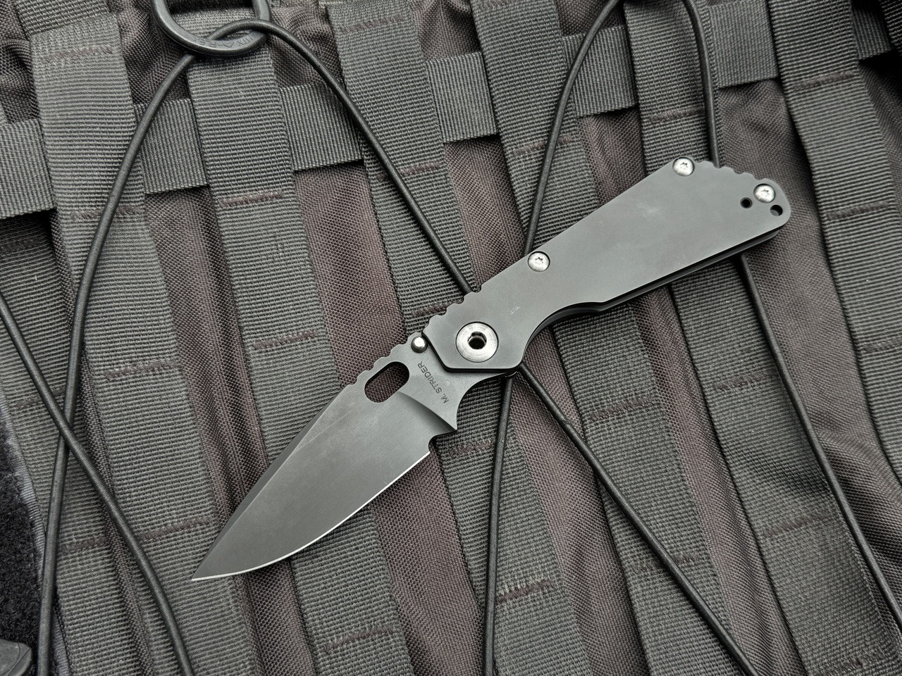 This is a pre-owned Strider SnG folder in black with silver hardware. This knife is in good-great used condition with some marks on the clip and clip side of the body, and some minor wear on the show side.