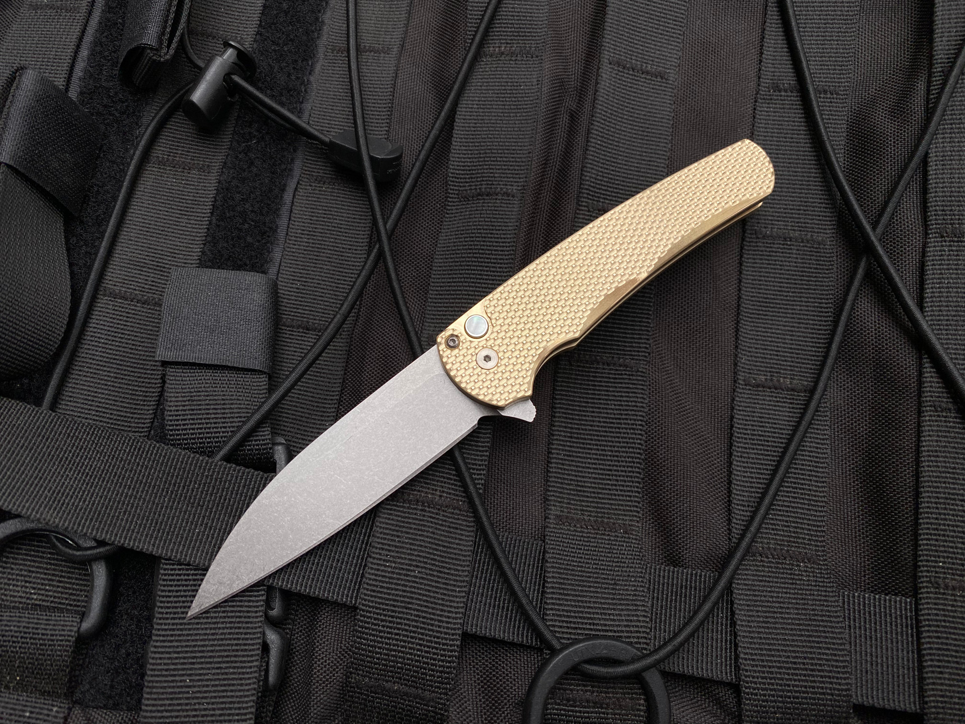 Pro-Tech Custom Malibu Flipper Bronze AL Textured Body w/ MOP Button and Magnacut Stonewashed Plain Edge Blade (3.5") 5311