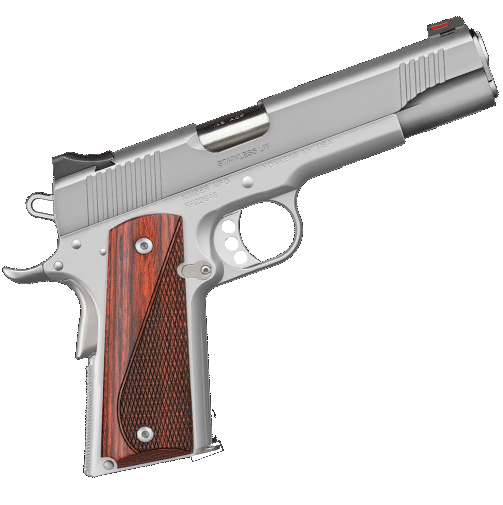 The STAINLESS LW is a limited time special offering 1911, with white dot rear sight and red fiber optic front sights,weight reducing aluminum frame, Stainless small parts and striking "cocobolo" laminate grips with checkered gripping area for positive hold round out this unique package. Match grade stainless barrel