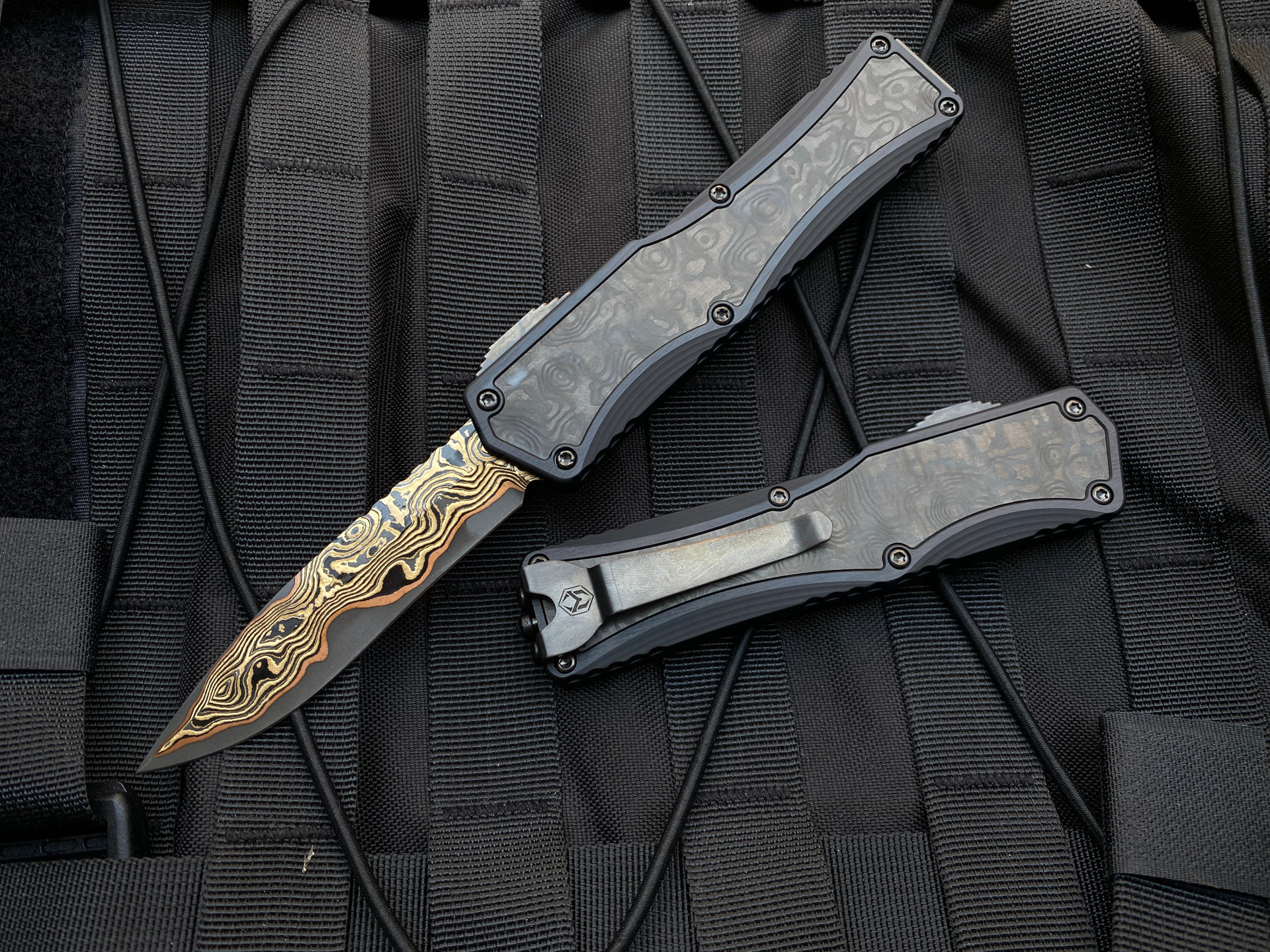 Heretic Knives Custom Colossus Black Body and Carbon Fiber Black Dunes Inlays w/ Baker Forge Damascus Recurve Blade and DLC Hardware