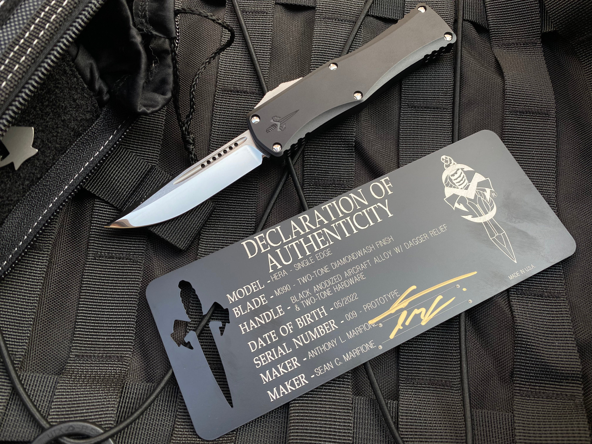 This Marfione Custom Hera prototype features the first ever single edge blade on the Hera platform. The body is a black anodized alloy with two tone hardware. The blade features the newest Diamondwash finish on a single edge grind