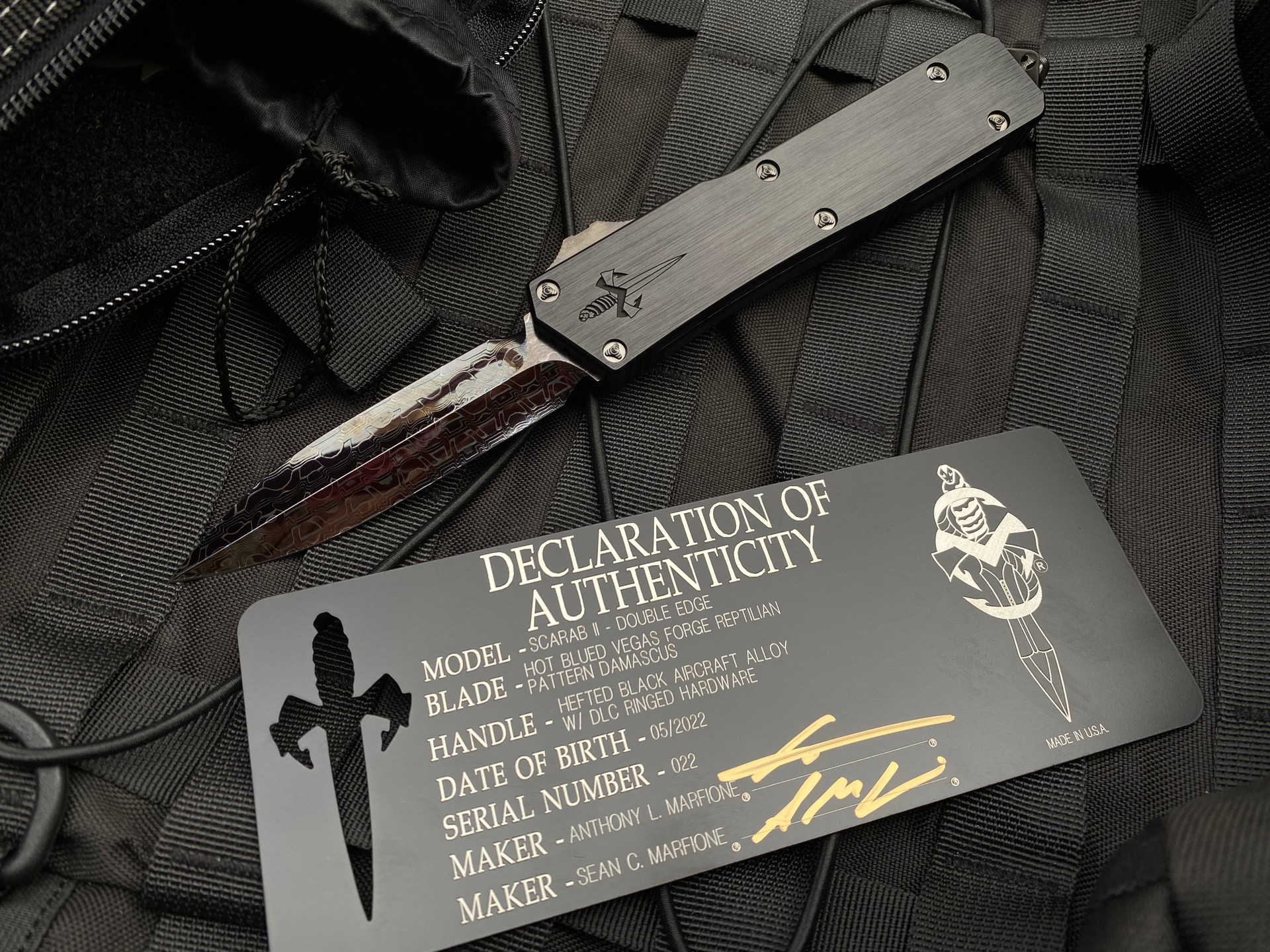 This Marfione Custom Scarab II features a black hefted alloy body with gorgeous DLC ringed hardware elements paired with a full DLC pocket clip. The blade is a double edge grind done with a Vegas forge hot blued reptilian pattern Damascus steel