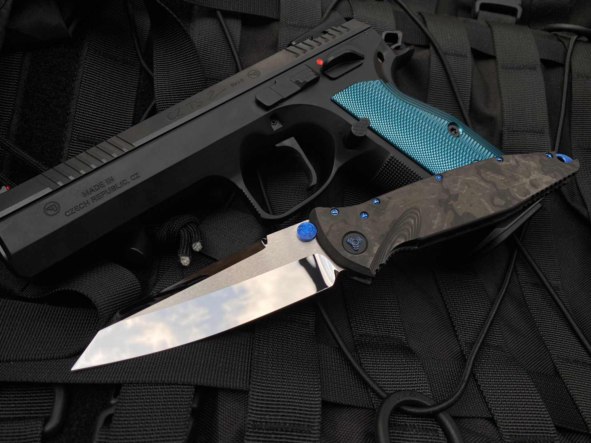 Marfione Custom Warcom Fat Carbon Black Camo Body w/ Blue Titanium Hardware and Mirror Polished Blade