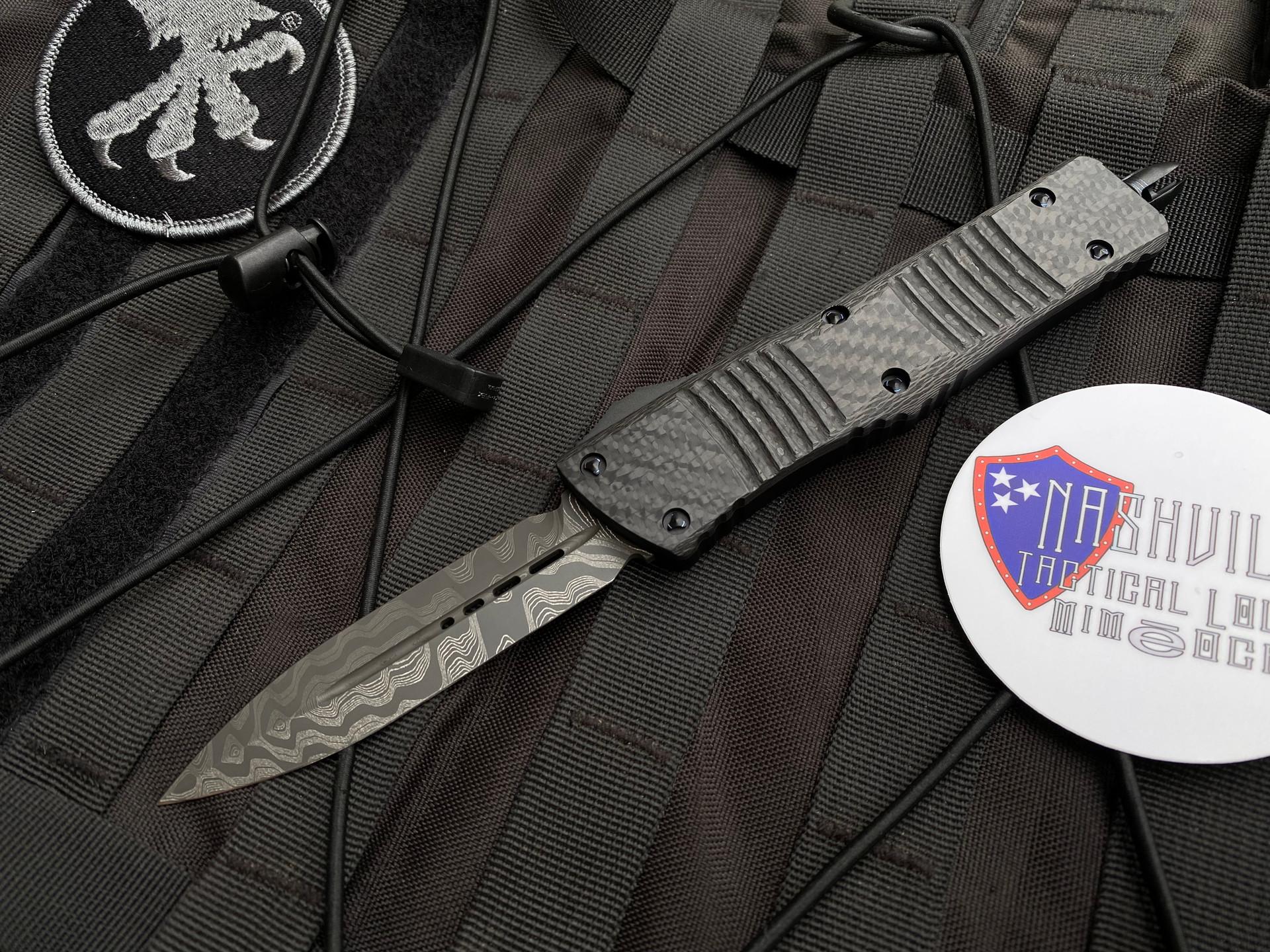 Overall Length: 9.5 inches Blade Length: 3.81 inches Blade Material: Damascus Handle Design: Standard Grooved, Black Blade Type: Double-Edge, Plain Blade Finish: Damascus Opening Mechanism: Automatic OTF Pocket Clip: Standard, black Hardware Screws: Titanium Blue Ringed Hardware Weight: 5.43 oz Warranty: Lifetime Warranty Country of Origin: Proudly made in the USA
