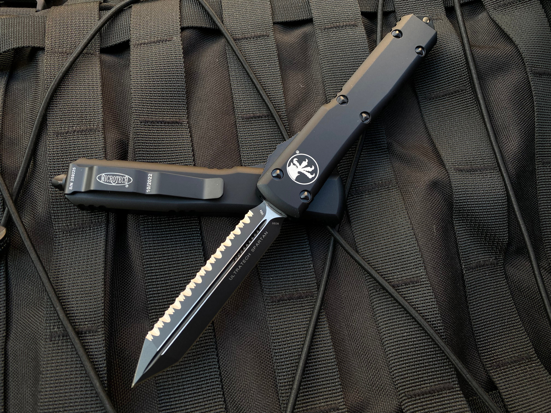 Microtech Ultratech Spartan Tactical Black Aluminum Body w/ Black Hardware and Black Full Serrated Blade (3.4”) 223-3T