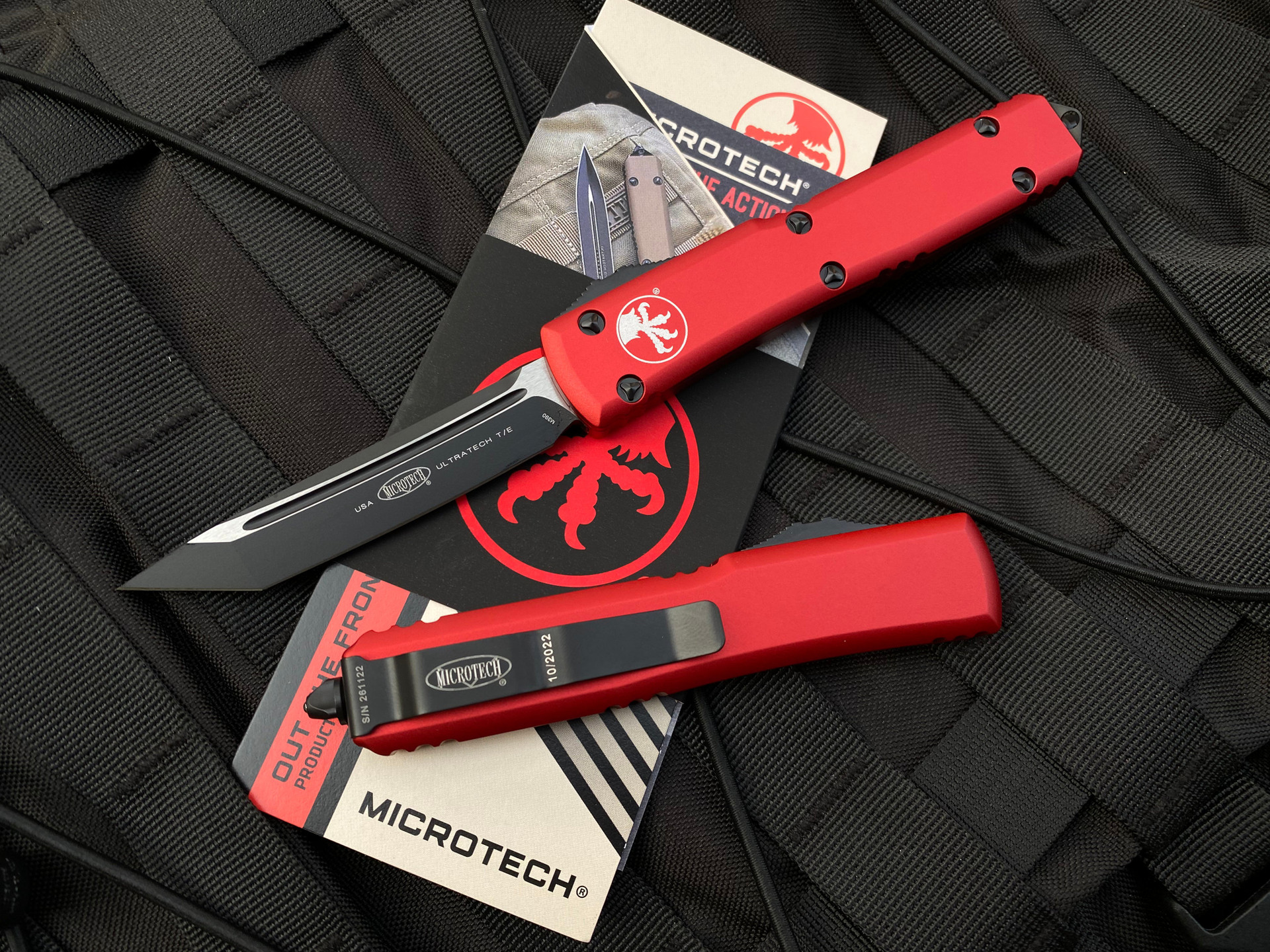 The Microtech Ultratech 123-1RD combines functionality and style with its tanto blade, black finish, plain edge, and eye-catching red handle. It's a versatile knife suitable for a wide range of tasks, from everyday carry to tactical applications.