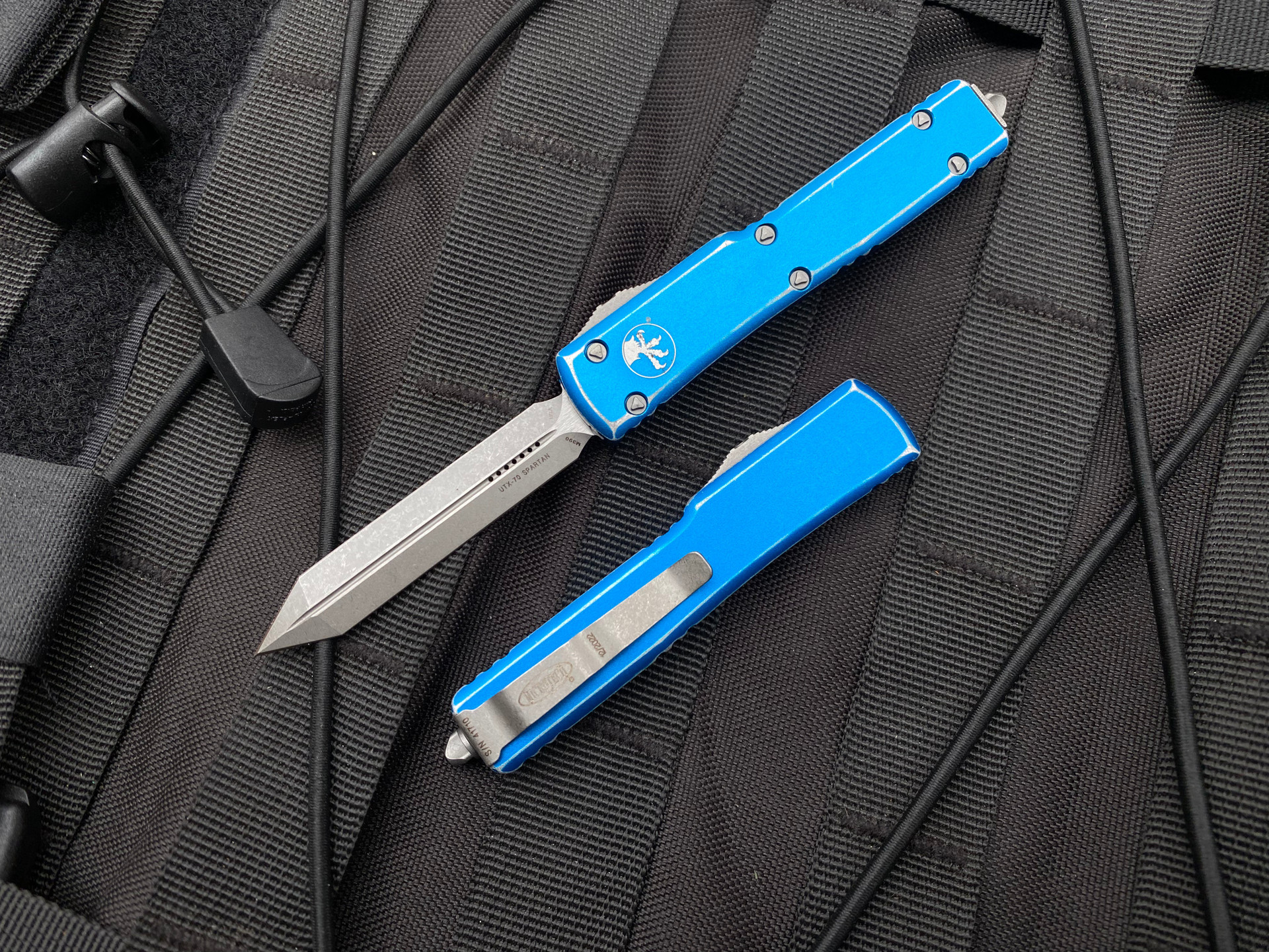 The UTX-70 Spartan is a blend of history and innovation. While it's compact, this knife embodies the might of the Spartans of yore. With the commitment of Microtech to precision and performance, the 249-10DBL model stands out with its distressed blue aluminum handle. The Spartan blade, characterized by the apocalyptic finish, is complemented by bead-blasted hardware, making it a blend of aesthetics and function.