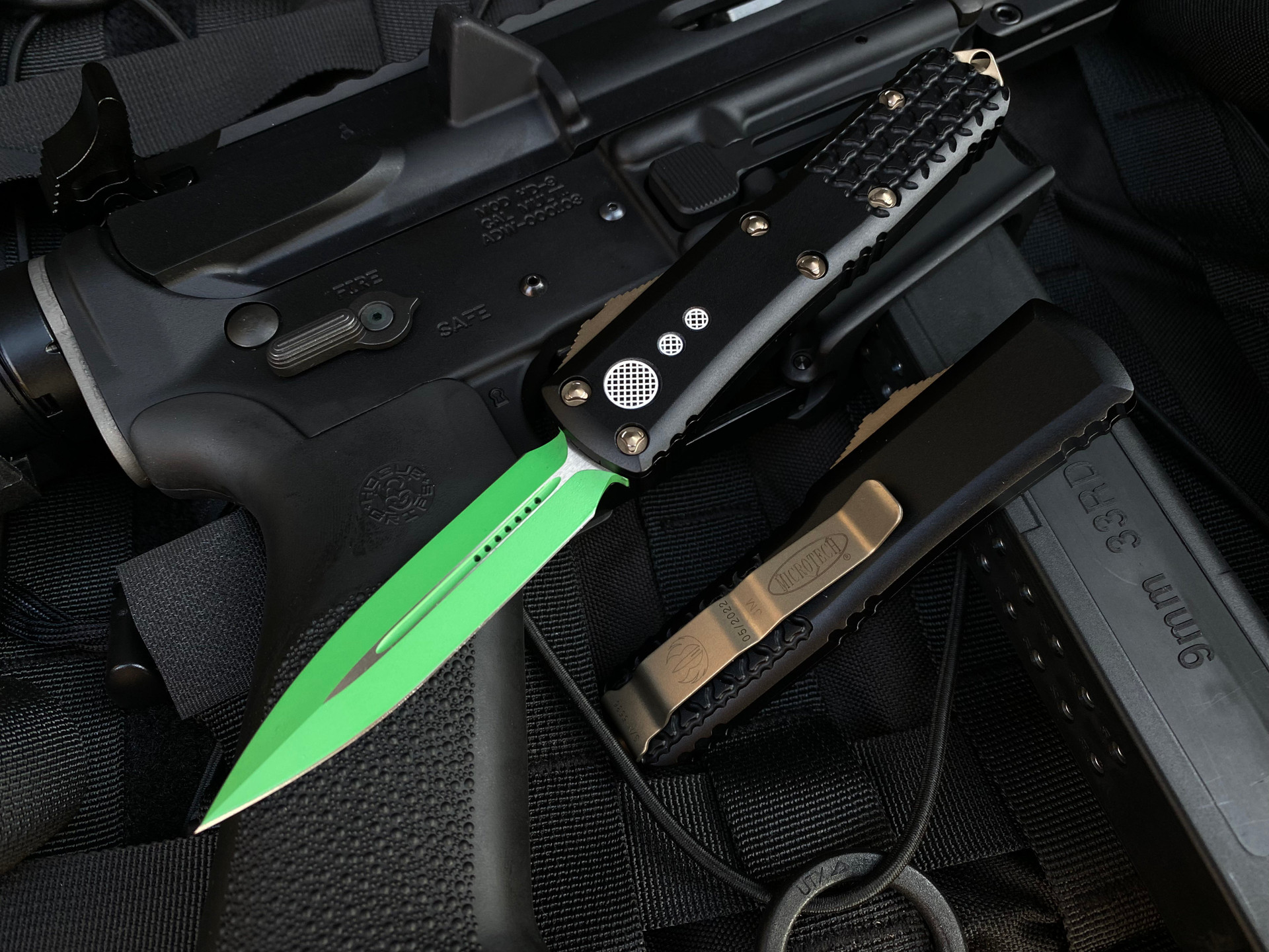 Microtech UTX-85 D/E Jedi Master Black Aluminum Textured Body w/ Green Cerakote Plain Edge Blade (3.11") 232-1JM