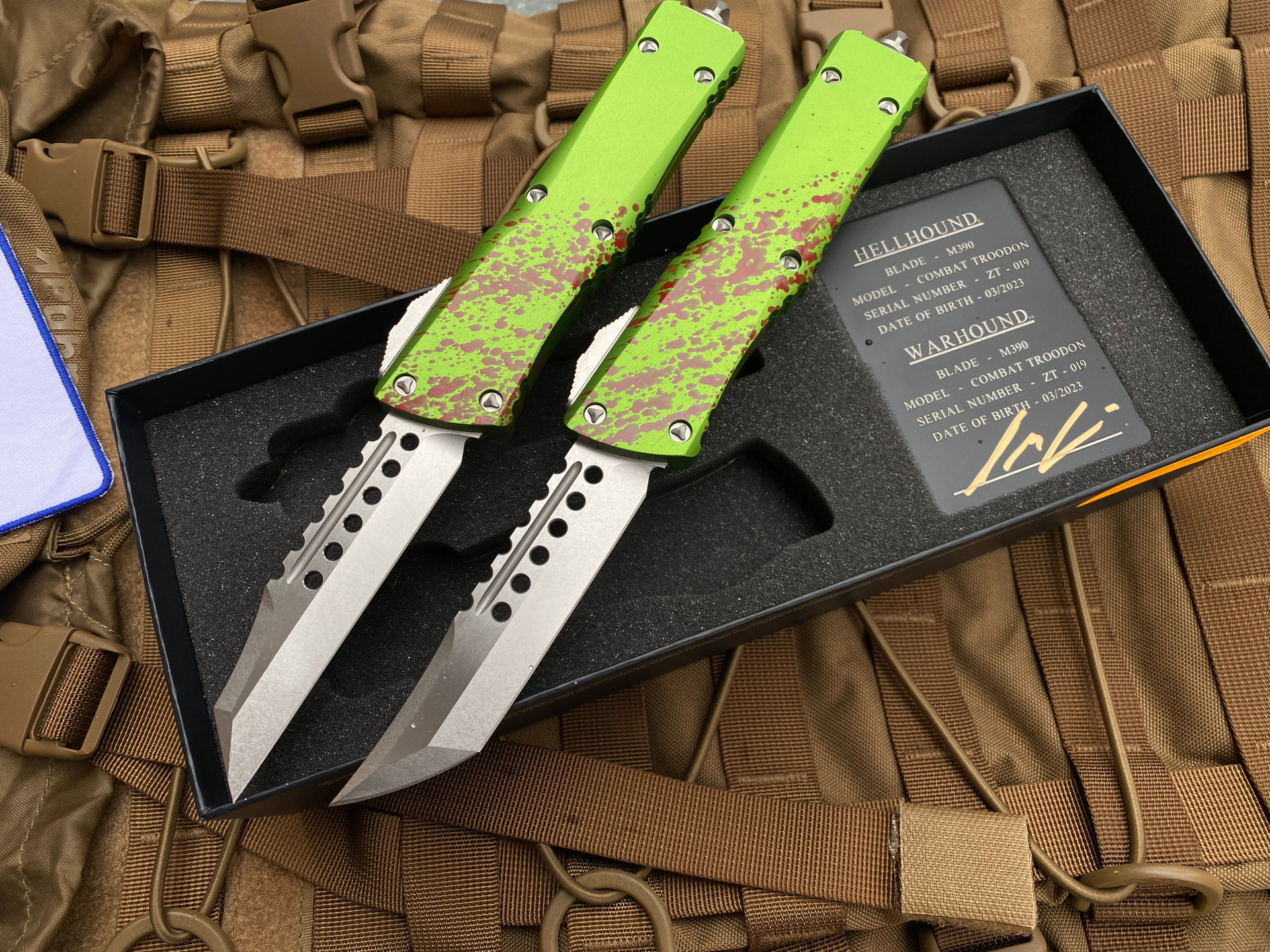 Microtech Zombietech Combat Troodon Set Hellhound and Warhound w/ Stonewashed Plain Edge Blades and Matching Serial Numbers (3.8”) 219-10SETZTS
