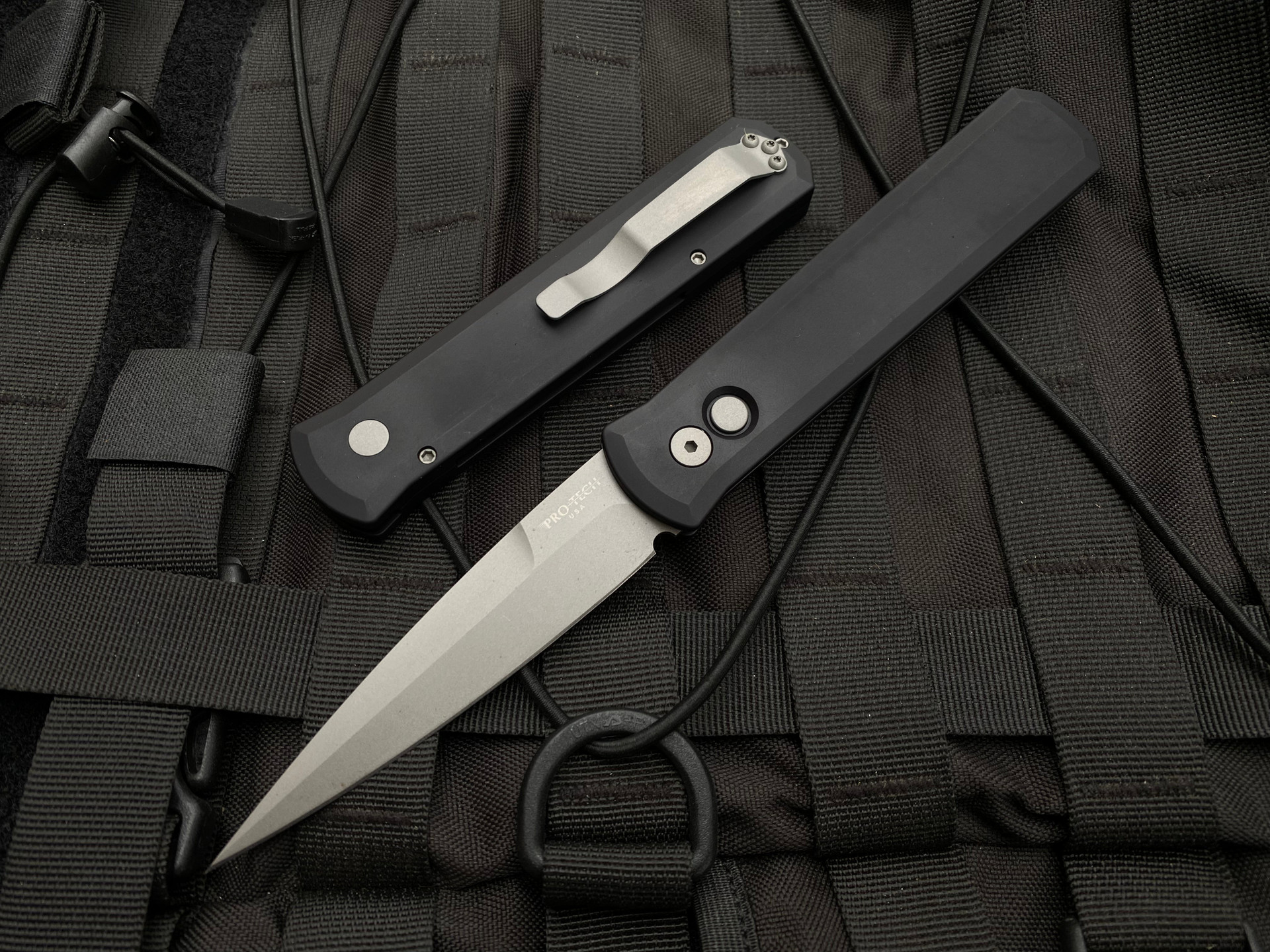 Pro-Tech Godfather Italian Style Auto Folder Black Aluminum Body w/ Bead Blast Plain Edge Blade (4”) 920