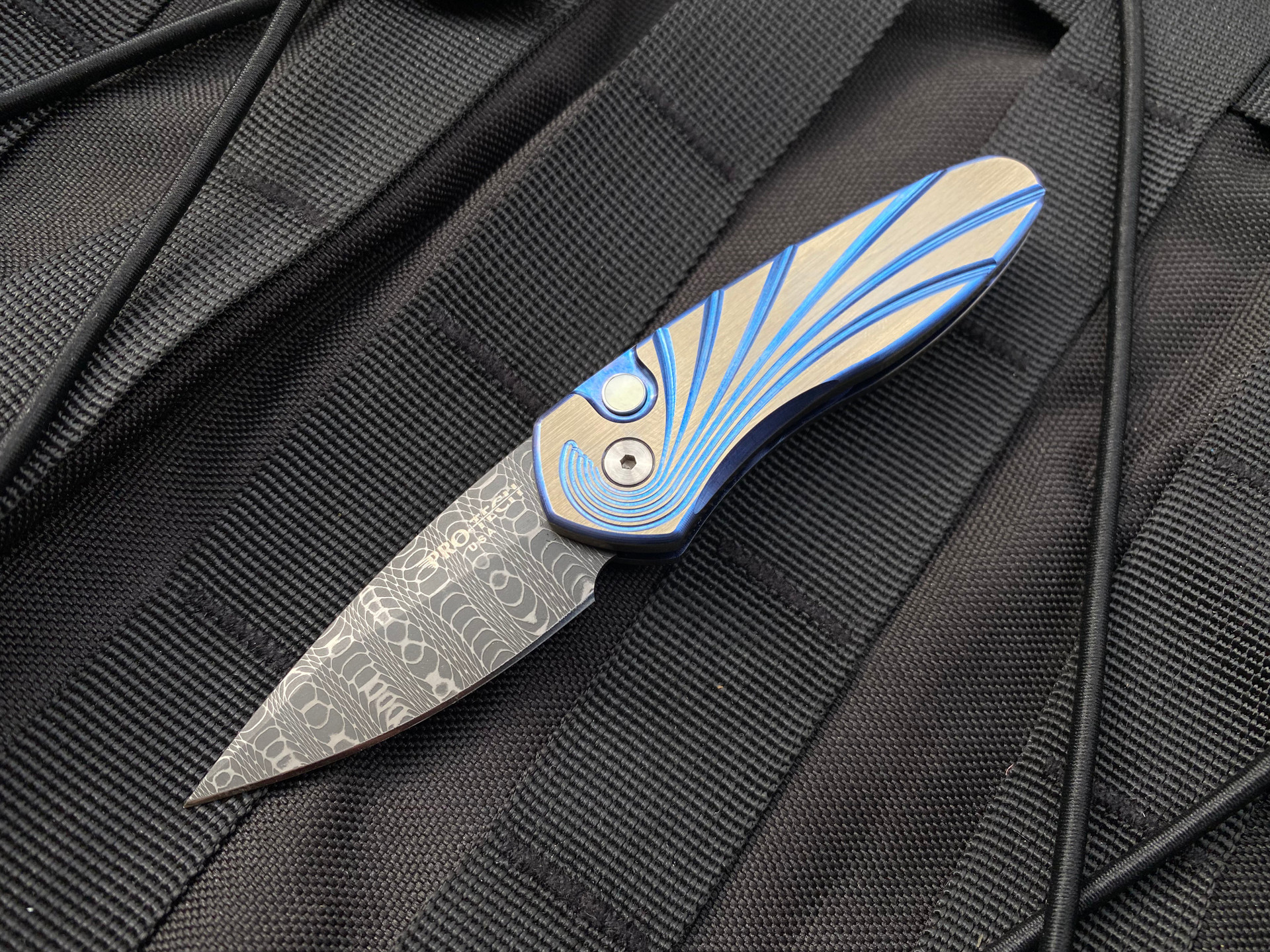 Pro-Tech Sprint Titanium Auto Folder Engraved Showside and Pearl Button w/ Vegas Forge Spirograph Blade (1.95”) 2951-S