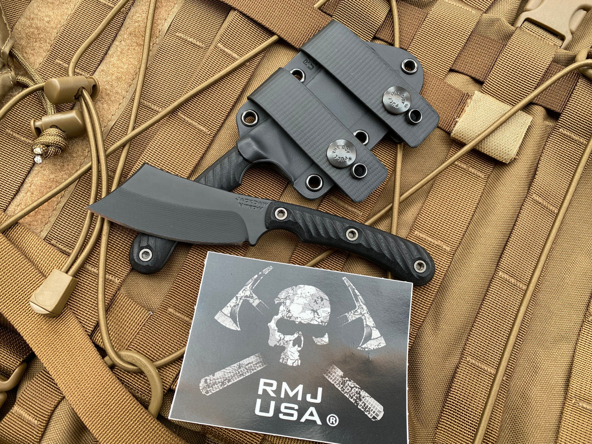The Jackdaw is a cleaver style EDC blade that's right at home in the woods or an urban environment. The blade has a black Cerakote finish for corrosion and glare resistance. The beveled and contoured G10 grips feature diagonal texturing for a not too aggressive, but still secure grip. The Jackdaw comes with a molded kydex scabbard with two MAD straps that allow for scout-style carry (horizontal) and inside the waistband (IWB) vertical carry. It is also MOLLE compatible and can be set up to attach to PALS webbing on any pack, plate carrier, or similarly equipped gear