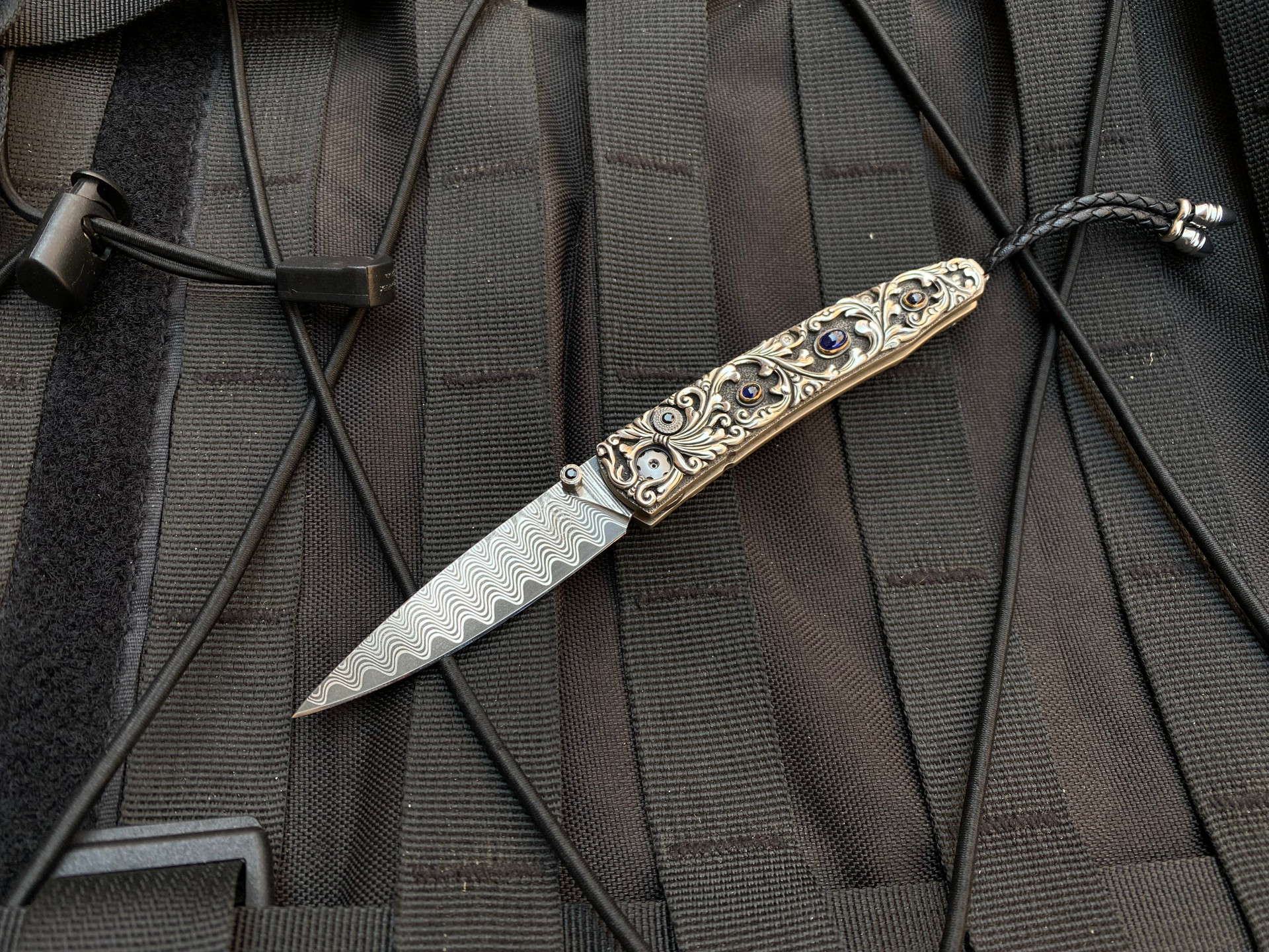The Lancet 'Radiant' features a frame of hand carved sterling silver with inlaid sapphires by Lee Downey. The blade is William Henry's signature 'Wave' damascus with a VG-10 core; the one-hand button lock and the thumb stud are set with spinel gemstones.Sleek, elegant, refined, and comfortable in the hand and to the eye, the Lancet defines the essential gentleman’s folder in the modern world. The ‘Radiant’ features some of the exotic materials, artistry and hand-forged metals that are the hallmark of William Henry's collections; a timeless heirloom to be proudly worn and used for a lifetime before being handed-down to another generation.