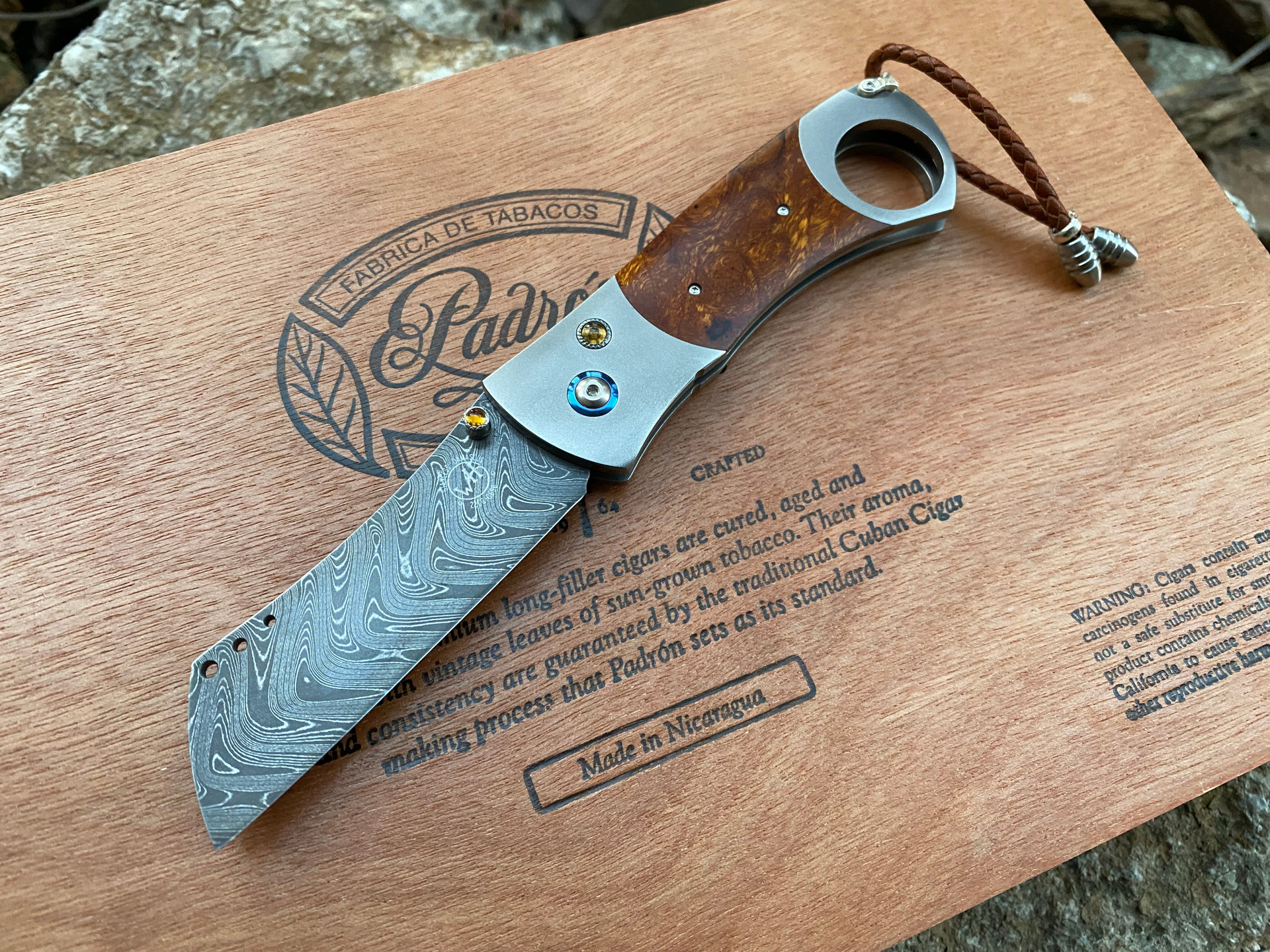 The Havana pays homage to the birthplace of fine cigars, and is without equal in the world of exotic cigar cutters. The thru hole in the titanium frame will accommodate up to a 52 gauge cigar, and the single sided precision ground damascus blade cuts cleanly thru your preferred smoke. The damascus is our stainless 'Boomerang' pattern by Chad Nichols featuring three alloys forged together into a tapestry in steel with an optimum hardness of HRC 59 for wear resistance. Inlayed Arizona Ironwood is hand-polished to fine luster, and citrine gemstones, titanium, stainless, and sterling hardware complete the presentation. This piece works beautifully as a cigar cutter and general purpose pocket knife!