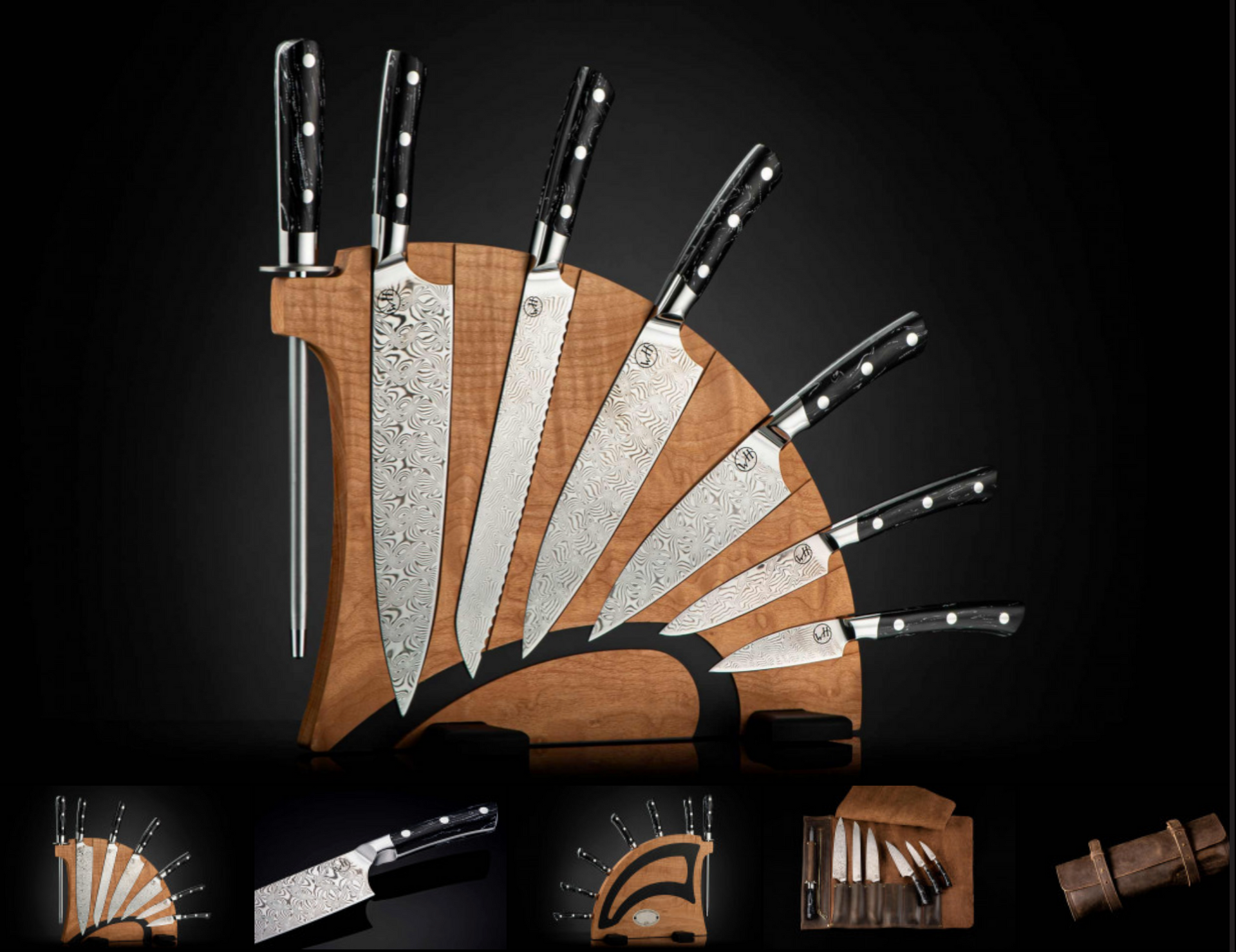This culinary set includes six knives and a sharpener presented in a beautiful AAA grade figured maple display. Each blade is crafted from forged 67 layer damascus steel in our signature “tribal” pattern, tempered to an optimal hardness of HRC 59-60. The bolsters and pins are stainless steel, finished with a durable black and blue G10 composite handle. The matching sharpener is diamond coated to allow quick touch up of your edges as needed. The patent pending display is built from solid American maple, with laminate inlays, hidden rare earth magnets, and anodized aluminum stabilizing feet. There is also an engraved stainless logo plate on the reverse side, which can be removed, custom engraved, and re-installed with two screws. Finally, your knife set is shipped in a lovely distressed leather roll/bag with blade protectors.