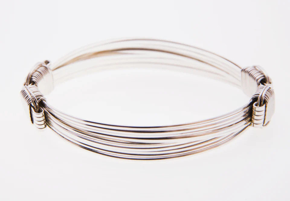 Lightweight Bracelet Sterling Silver 5 strand - The body of this silver on silver light weight bracelet is made of 5 strands of 16 gauge sterling silver wire. The knots are hand wrapped in complimenting sterling silver. The bracelet measures just under 1/2 an inch wide and can be worn alone or stacked with other favorites.